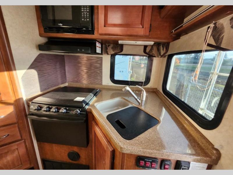 The kitchen area offers everything you need to easily prepare and cook food while you are adventuring. There is a three burner range, double kitchen sink, overhead storage, and nice size pantry for your canned goods.