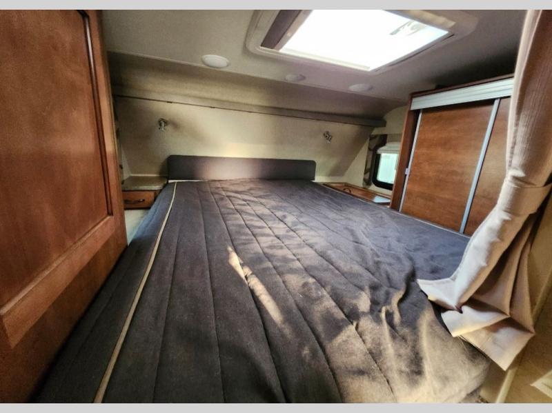Step up to a cabover queen size bed in front with large wardrobe on the right as well as a hamper just beyond the wardrobe. On the opposite side of the bed find a cabinet, and additional storage area.