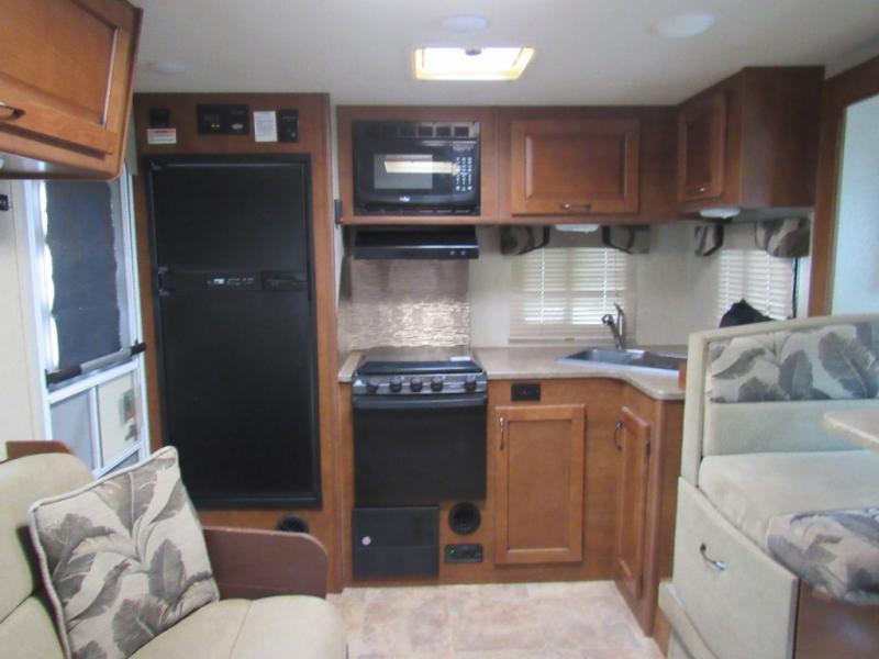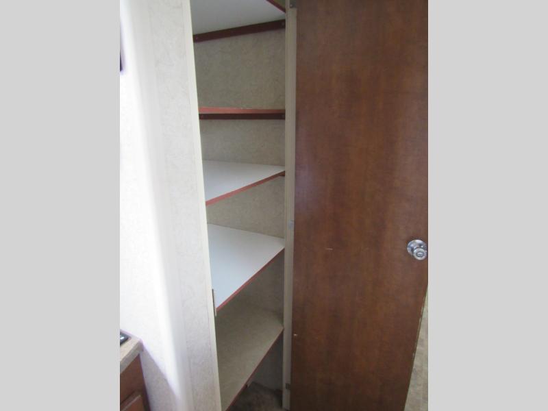 Enter the rear most side door and find yourself in the spacious galley with refrigerator, three burner range, and double sinks for easy cleanup. There are also overhead storage cabinets for dishes, canned and dry good storage, and more.