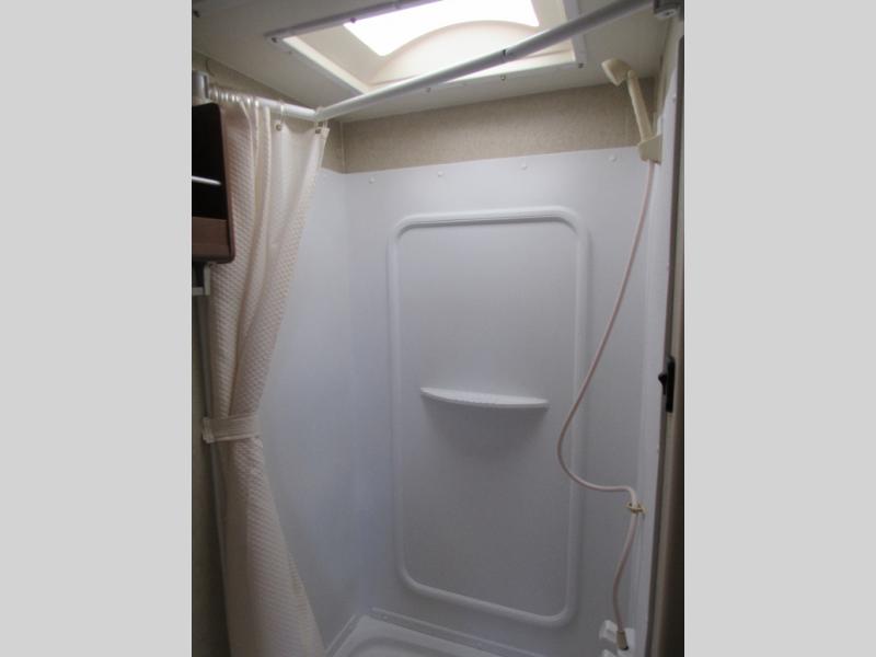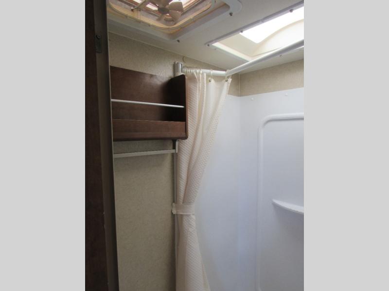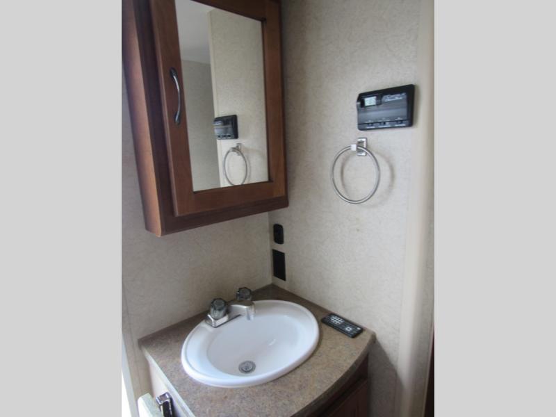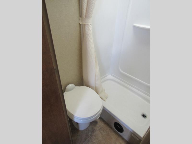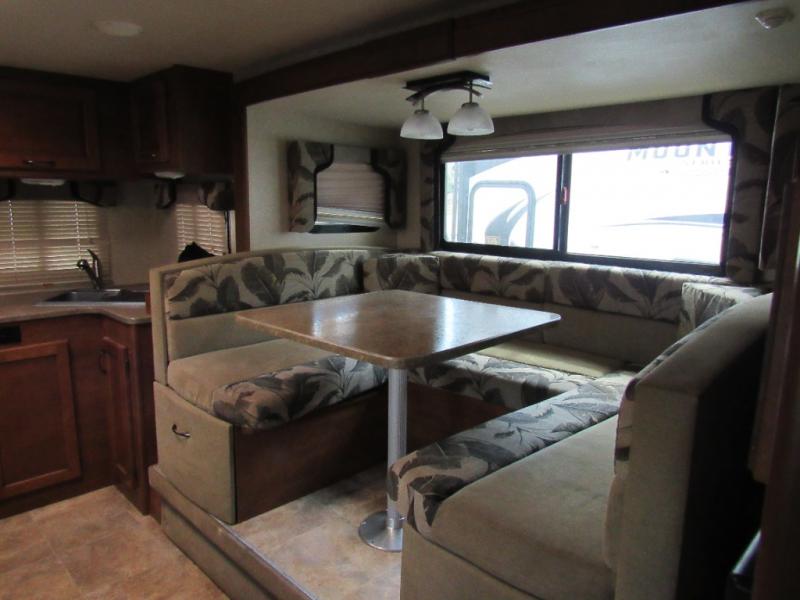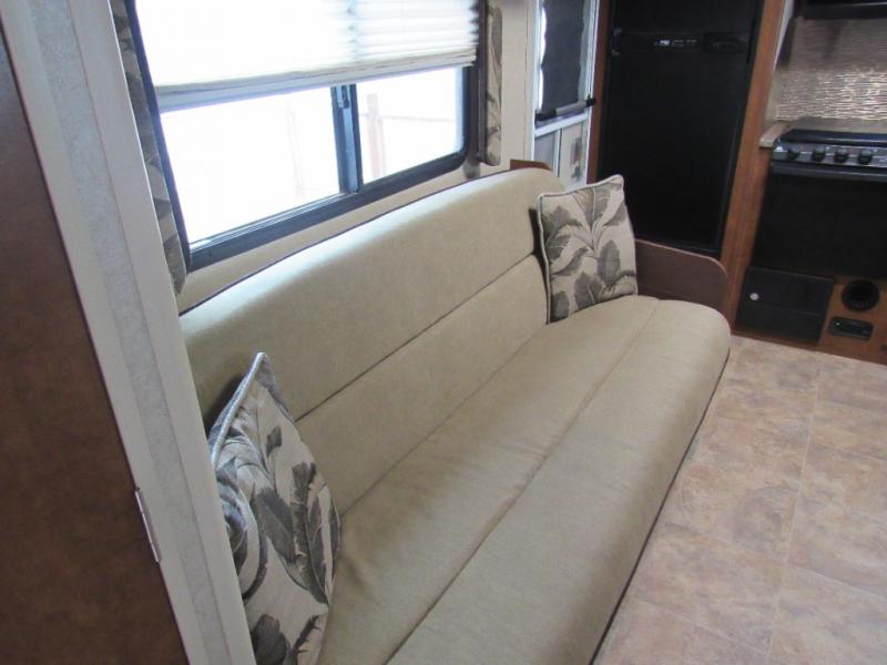The slide out u-shaped dinette and sofa bed with overhead storage are opposite one another and each sleep two individuals comfortably when folded down at night. The convenient entertainment center nearby can easily be viewed by any seating in the room.