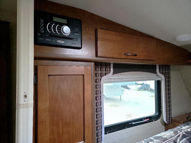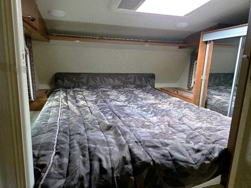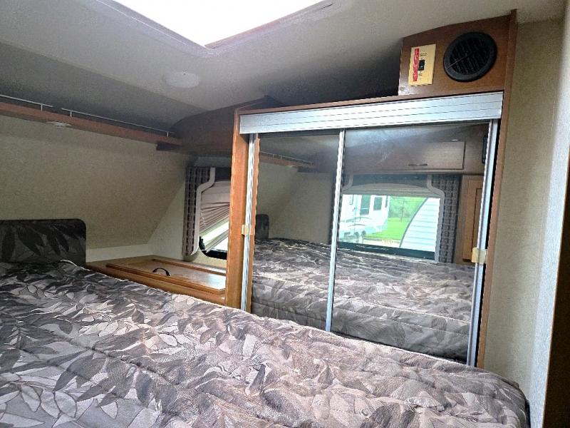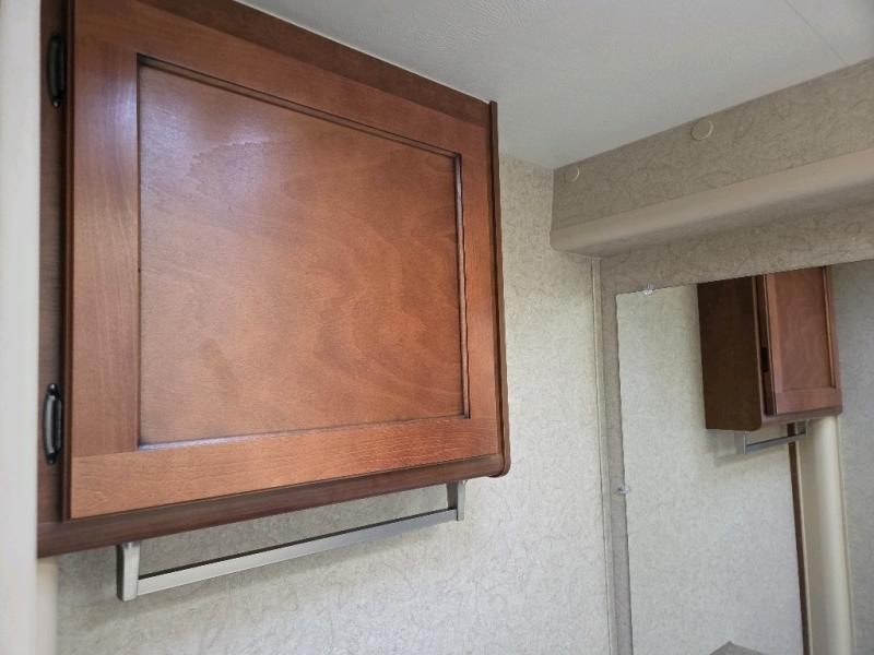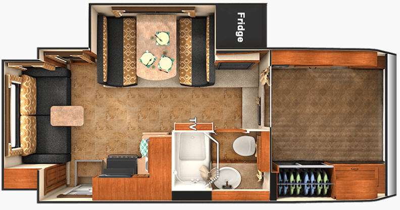 Step up to a cabover queen size bed in front with large wardrobe on the right. An overhead cabinet is found on the left side, and a wardrobe along with a convenient hamper is located on the right to help you keep things neat and organized.