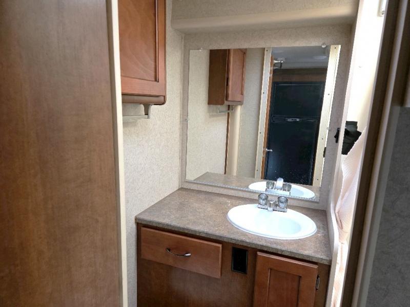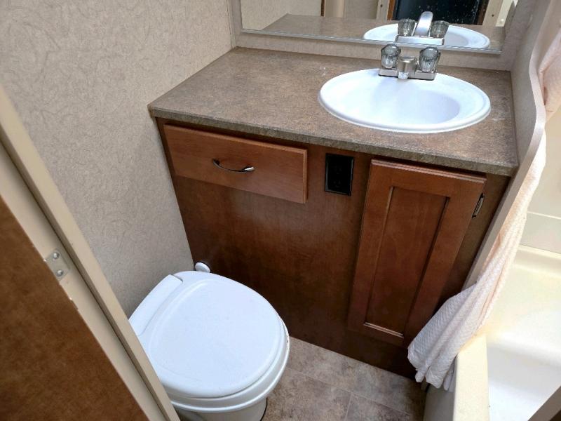 The bath is located toward the step up in front and features a shower, toilet and sink. There is also a mirrored door medicine cabinet.