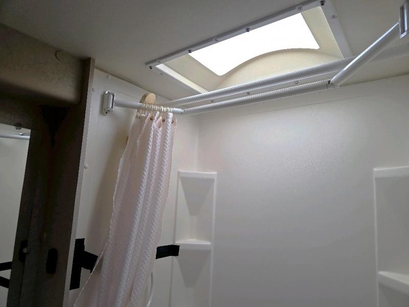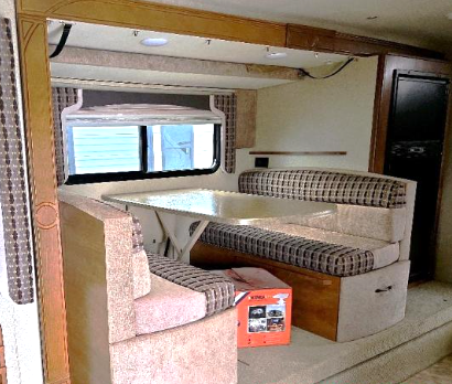 Across from the dinette along the outer bathroom wall find an entertainment center which will allow you to add an optional 24" 12 volt LED TV.