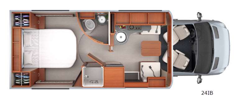 The perfect use of space in this Unity class B+ diesel coach by Leisure Travel. Model 24IB features a walk-around queen bed in the rear, a three piece dry bath, and a comfortable seating area up front for meals and just hanging out.
