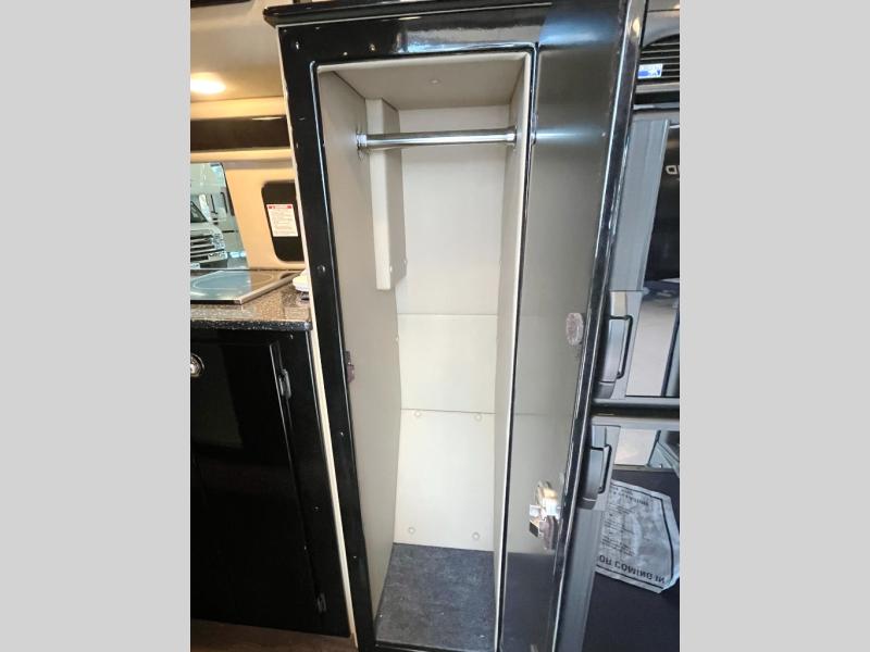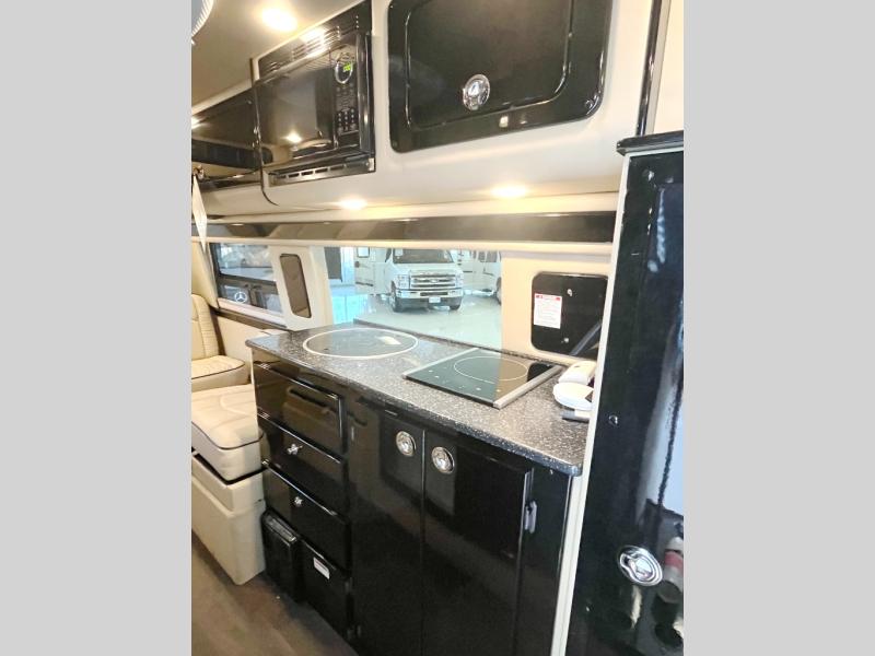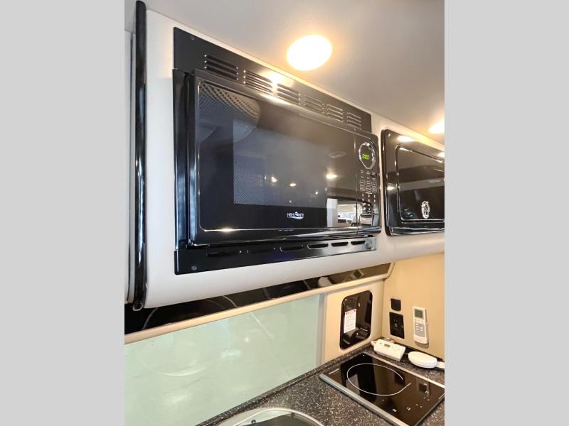 In front find a closet for your clothing, a 12 volt refrigerator, and a round single bowl sink with cover, plus a two burner induction cook-top for meals. There is also a microwave oven.