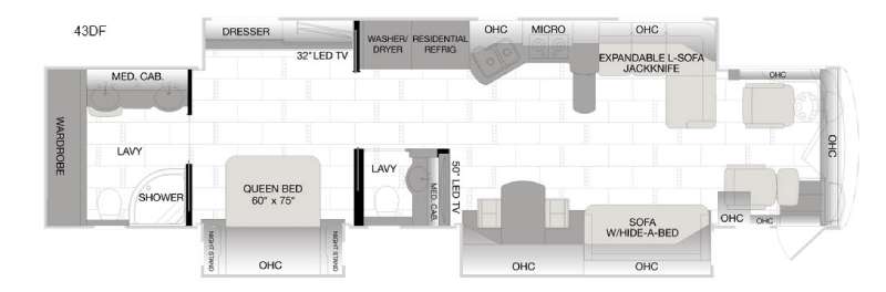 As you enter the motor home, along the passenger side there is a slide that has a sofa bed with hide-a-bed, and a free-standing table and chairs with an overhead cabinet. Adjacent to the slide there is a 50" LED TV. On the opposite side of the motor home you will find a full wall slide with an expandable l-sofa, two burner range, double kitchen sink, residential refrigerator, washer/dryer, 32" LED TV in the bedroom, and a dresser in the bedroom.