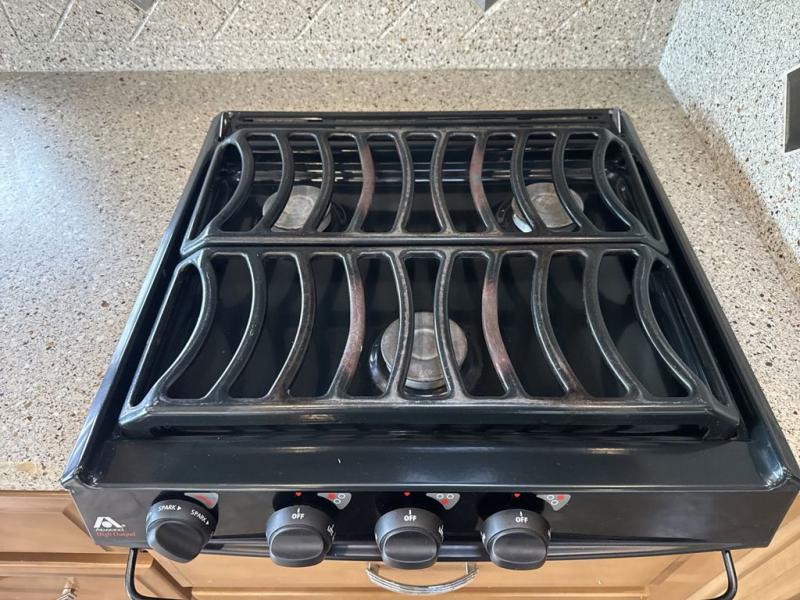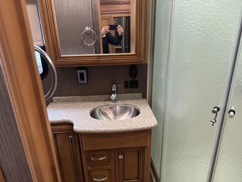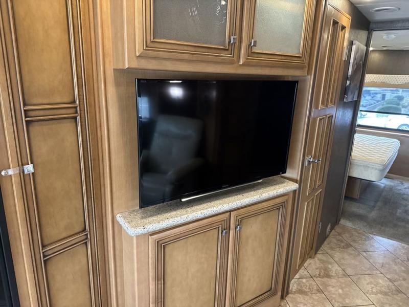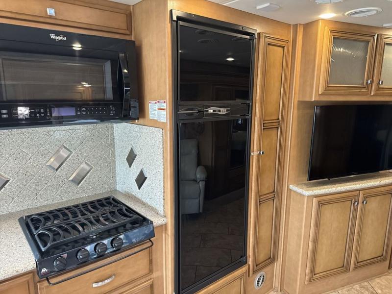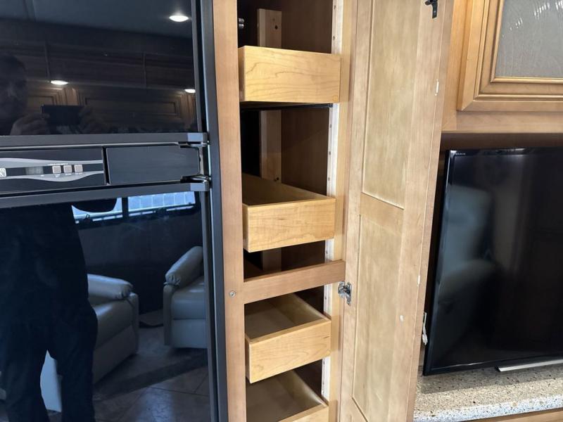 Stepping inside this motor home you will find along the curbside there is an angled double kitchen sink, three burner range, refrigerator, and pantry. Adjacent to the pantry you will find a dry bar with a TV.