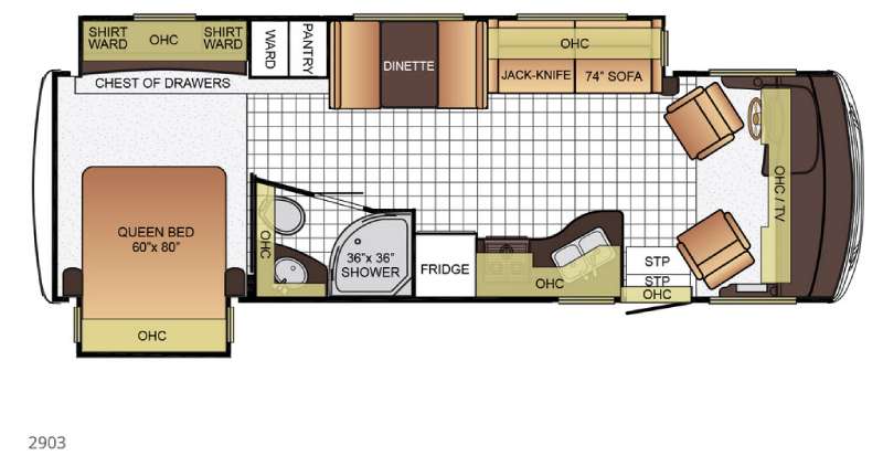 Starting in the bedroom the full wall slide offers two shirt wardrobes, a chest of drawers, overhead cabinet, a wardrobe, pantry, dinette, and jack-knife sofa with an overhead cabinet.