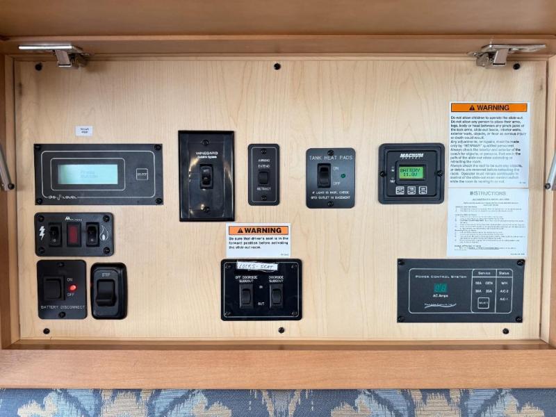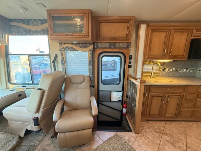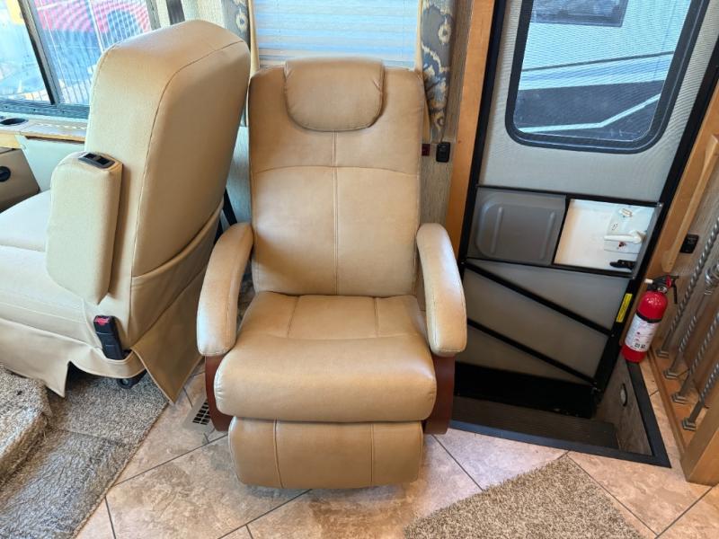 As you enter the motor coach, to the right is a recliner with overhead cabinets. The driver and passenger's chairs rotate to provide more seating in the living and kitchen space. There is additional storage above the cab.