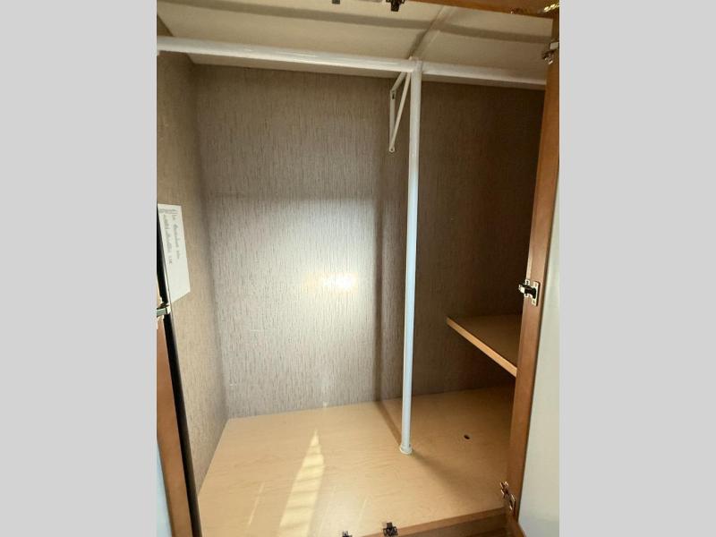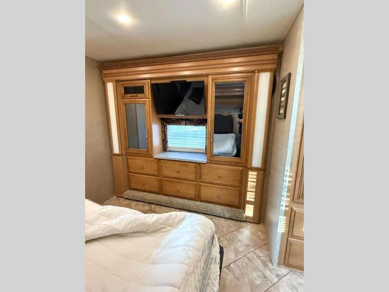 As you head to the rear bath, slide the master bedroom door open to see two slides, one slide includes the king bed with overhead cabinets, the other slide offers a chest of drawers and overhead cabinets including a TV.