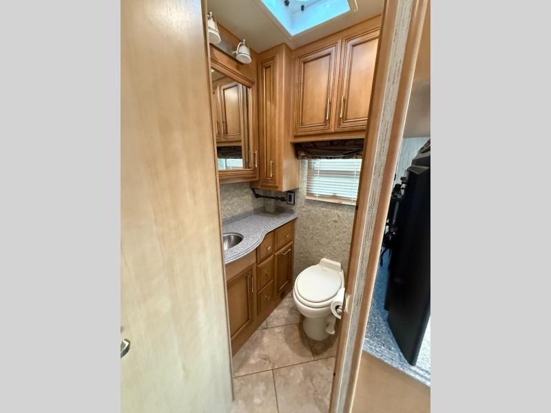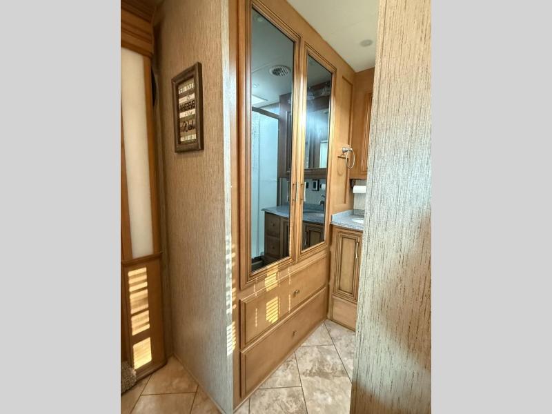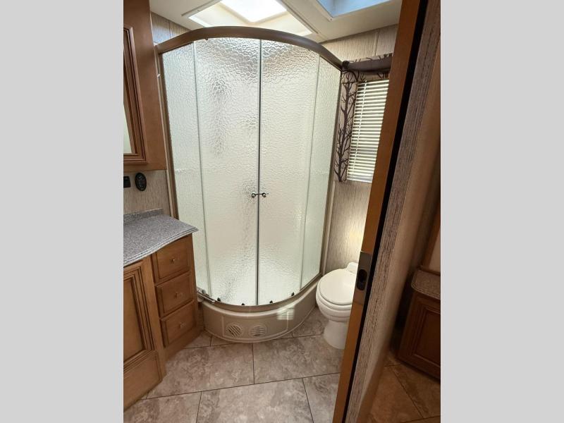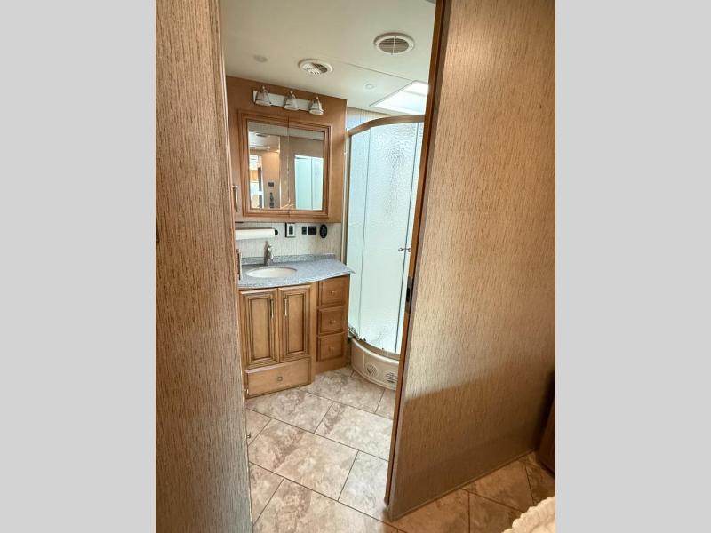 The master bath is located in the very rear of the motor coach. The bath includes a toilet, corner shower, sink, and a wardrobe with mirror doors.