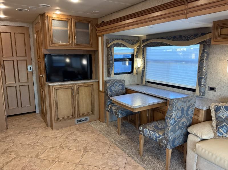 Along the road side there is a slide including a 87" jack-knife sofa with overhead cabinets, and a booth dinette. Next to the dinette there is a dry bar with a TV. Around the corner from the dry bar is a convenient half bath including a sink, toilet, and a linen cabinet. Across from the half bath is a wardrobe or choose the optional washer/dryer for this space.