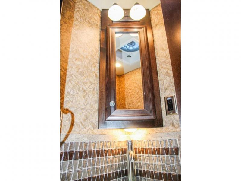 The half bath is very convenient, just off of the kitchen and living area. Inside the half bath you will find a toilet, sink, medicine cabinet, and linen cabinet.