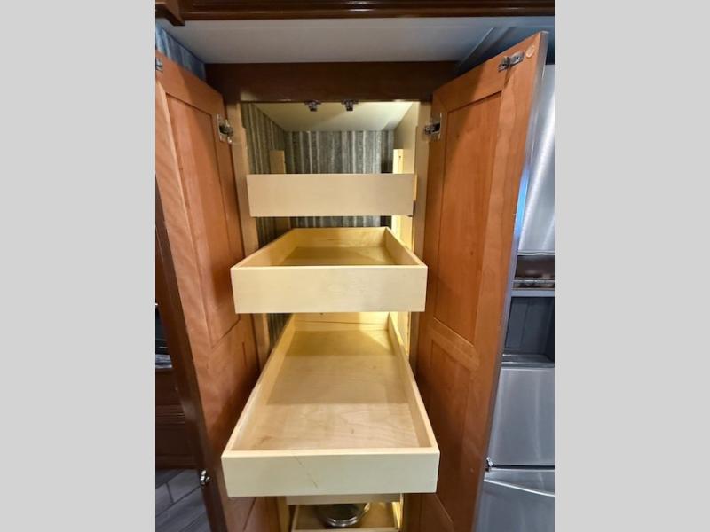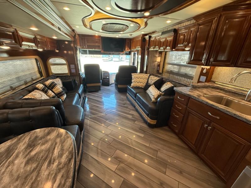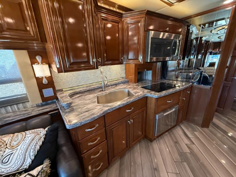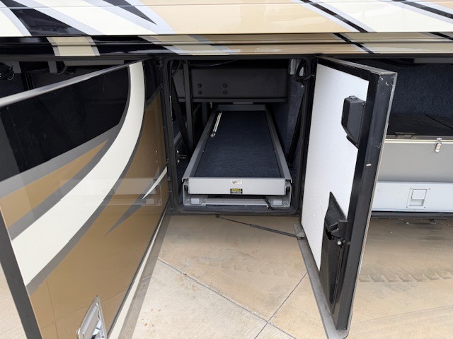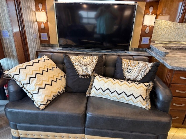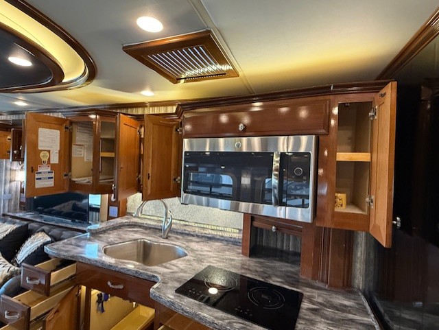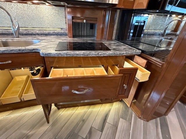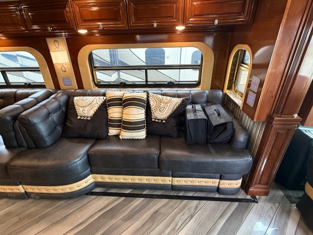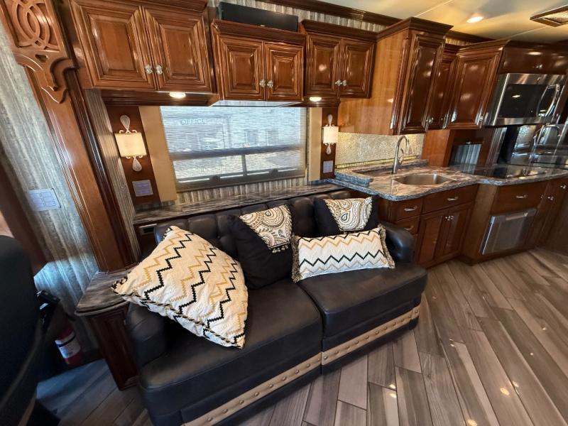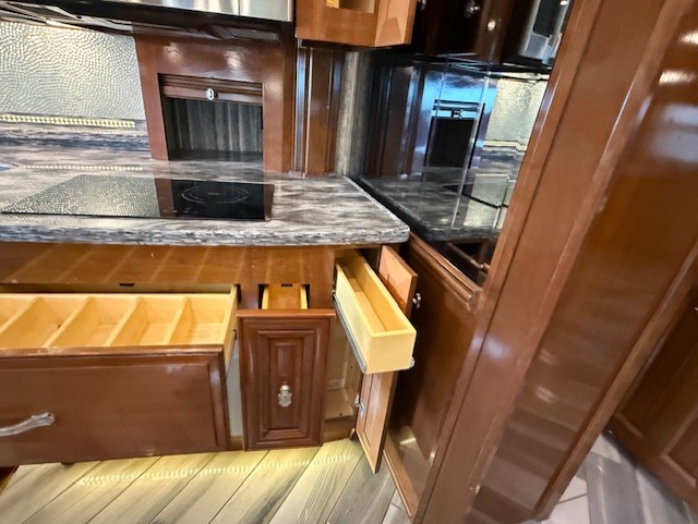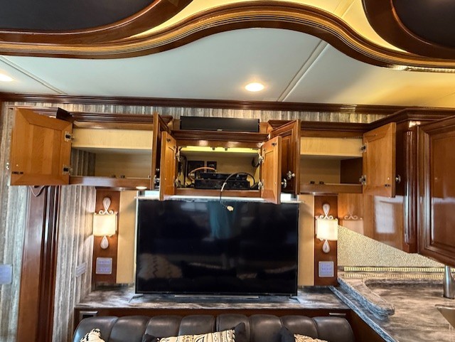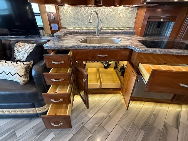 As you enter the motor home, you will see a large slide out along the road side wall that stretches from the living, kitchen, and even into the bedroom. The slide has a hide-a-bed sofa, hide-a-leaf dinette with chairs and buffet, refrigerator, pantry, and TV in the bedroom with overhead cabinets. Across from the sofa is another slide that includes a 68" fixed sofa, entertainment center with power lift TV, overhead cabinets, kitchen sink, countertop space, and a two burner range.