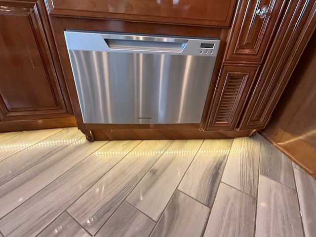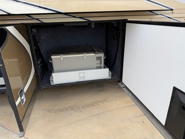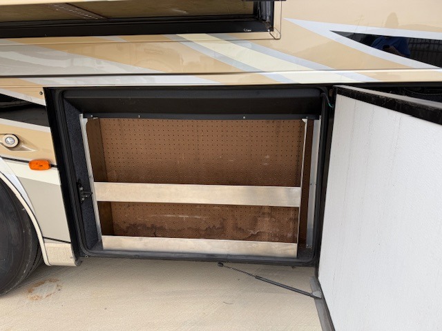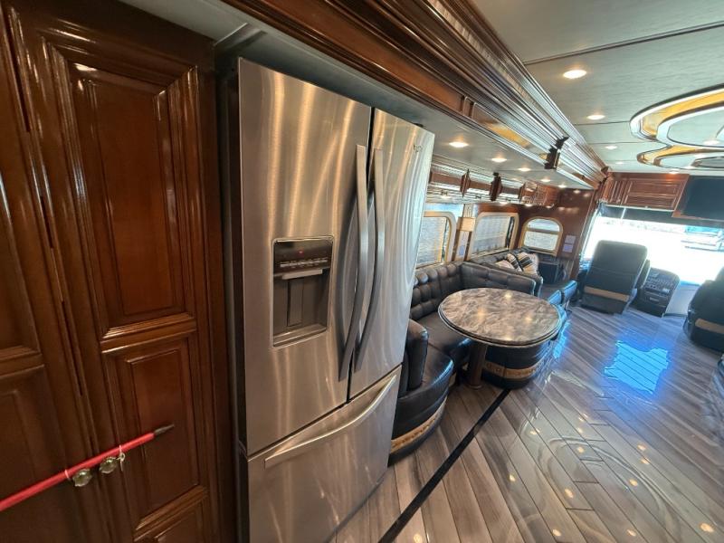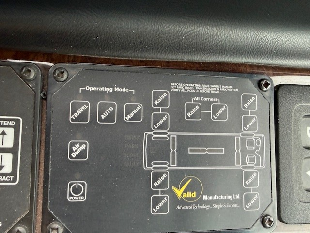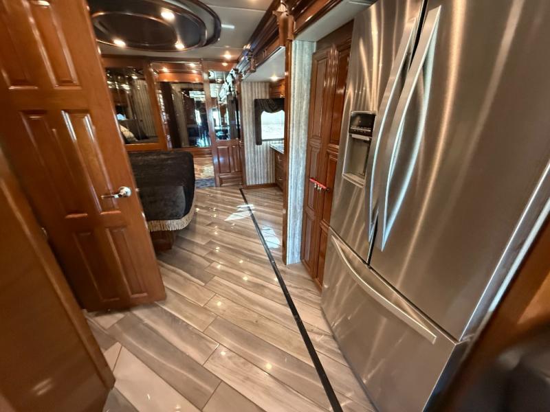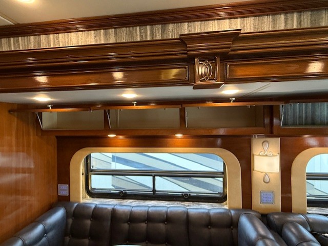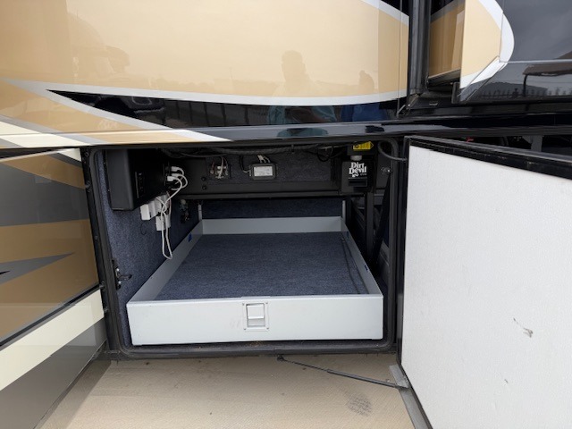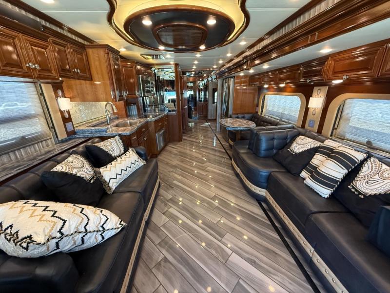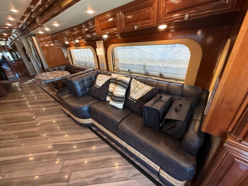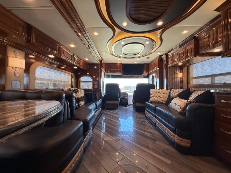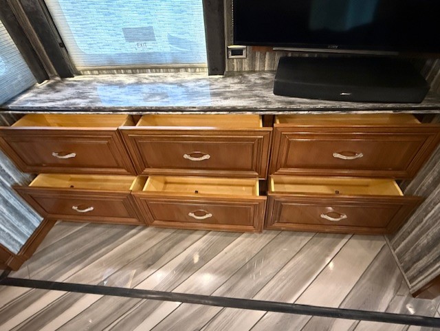 As you enter the motor home, you will see a large slide out along the road side wall that stretches from the living, kitchen, and even into the bedroom. The slide has a hide-a-bed sofa, hide-a-leaf dinette with chairs and buffet, refrigerator, pantry, and TV in the bedroom with overhead cabinets. Across from the sofa is another slide that includes a 68" fixed sofa, entertainment center with power lift TV, overhead cabinets, kitchen sink, countertop space, and a two burner range.