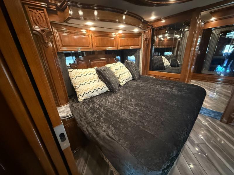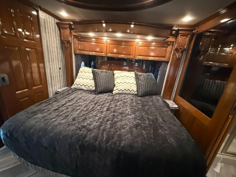 The master bedroom includes a king size bed slide out with nightstands, and the TV and overhead cabinets mentioned in the wall slide above.