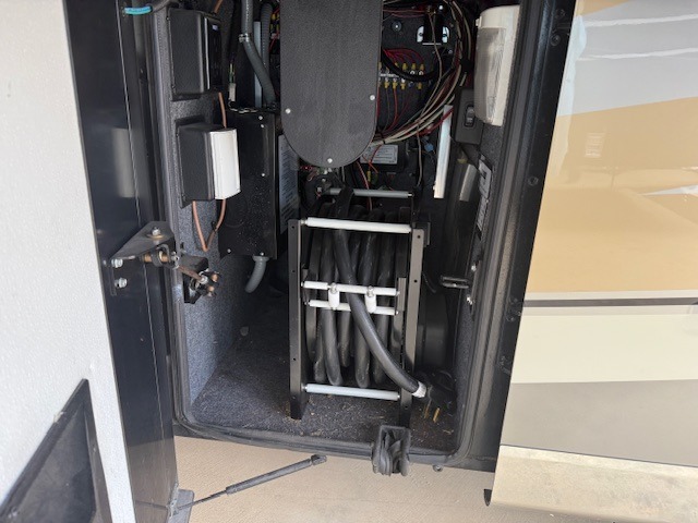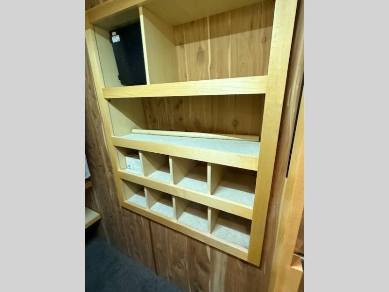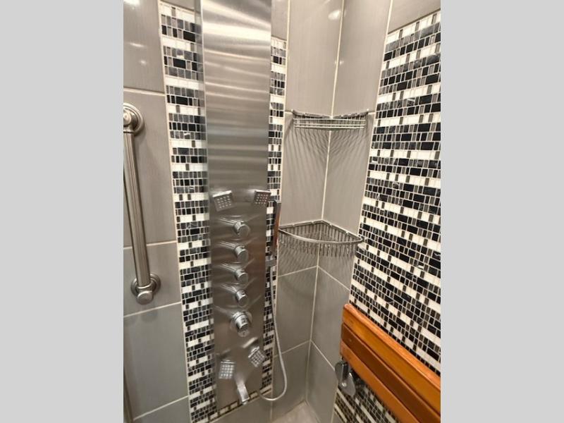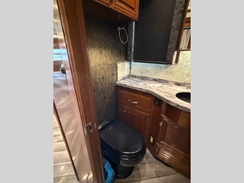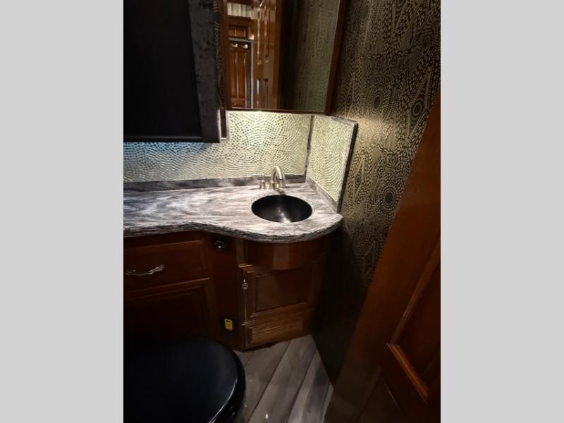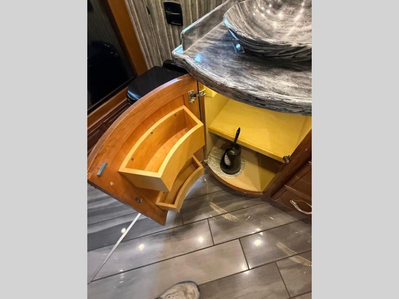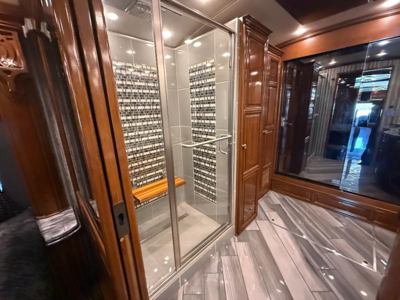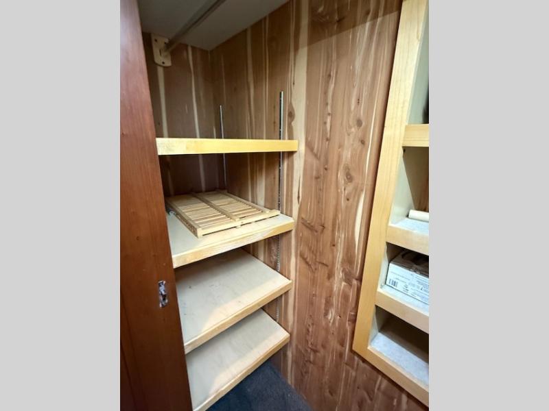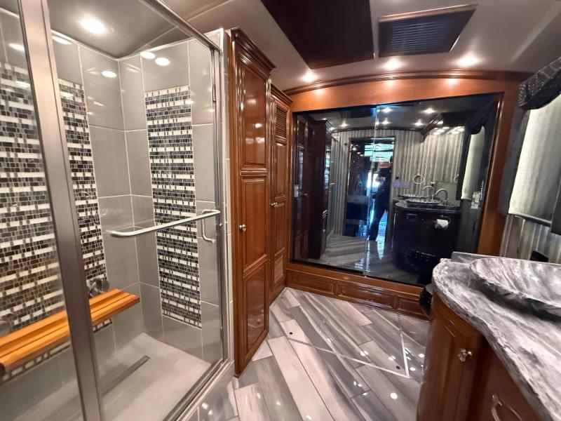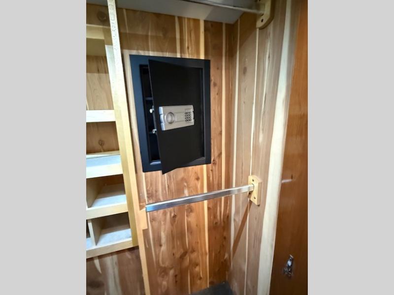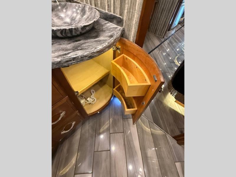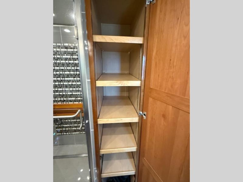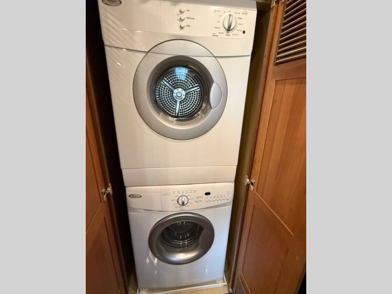 In the rear of the motor home you will find a large bathroom. The bathroom has a 40" x 32" shower, linen cabinet, washer and dryer, wardrobe with sliding mirror doors, adjustable shelves, a toilet, and two sinks. There is also cap storage and a safe.