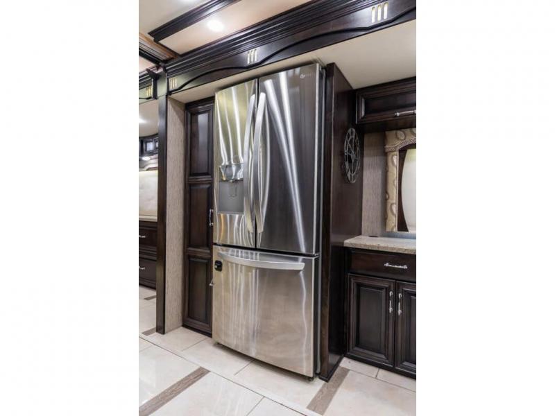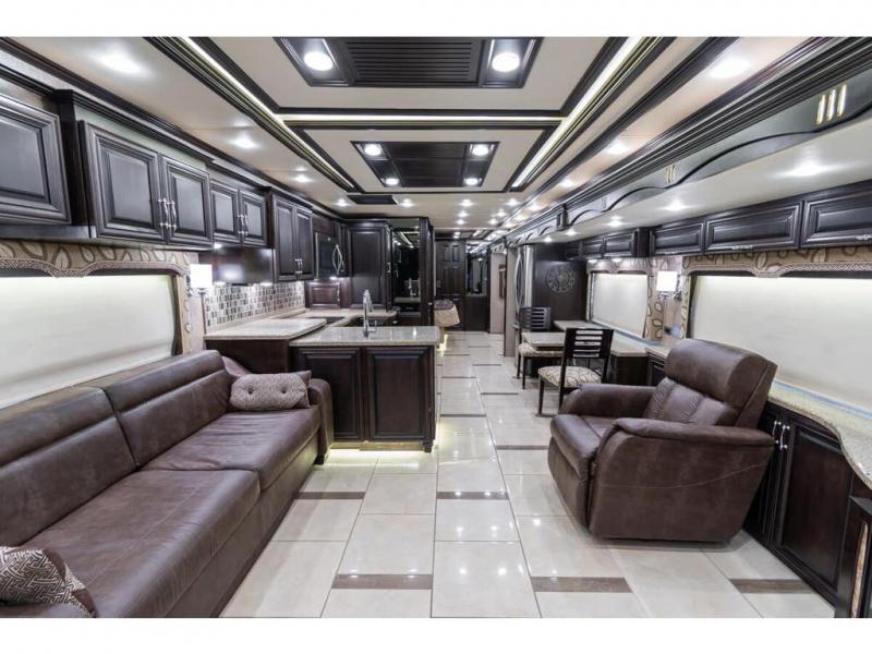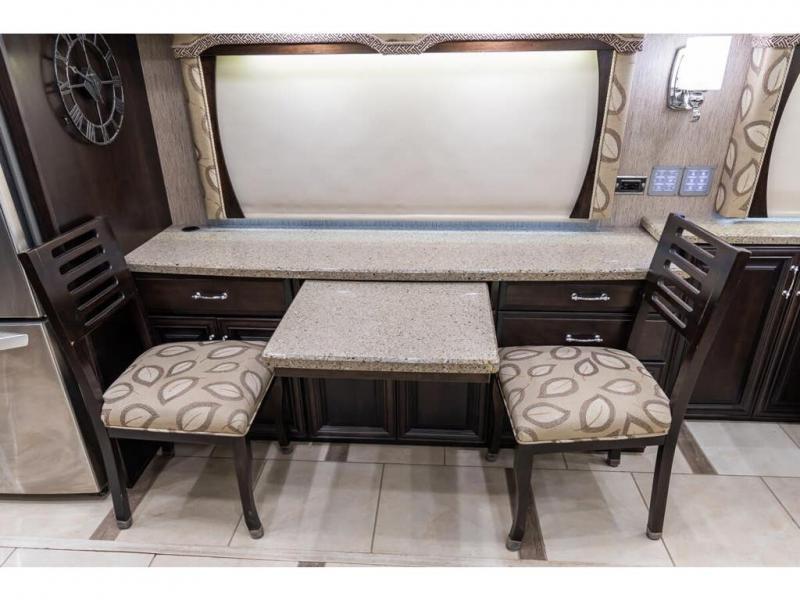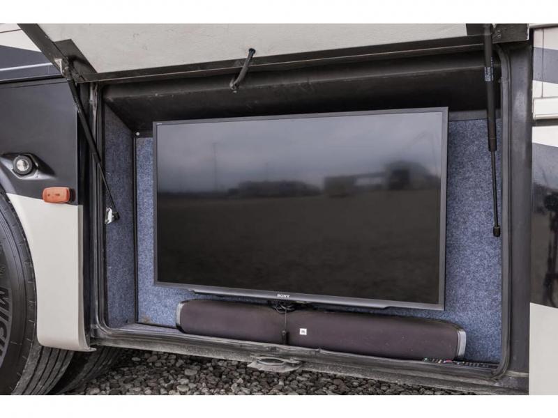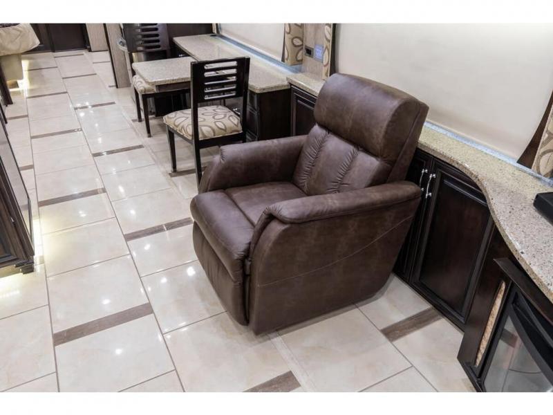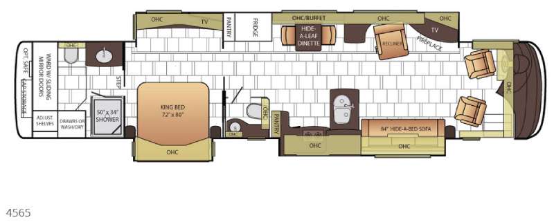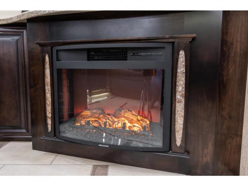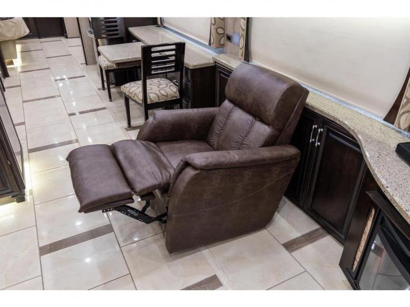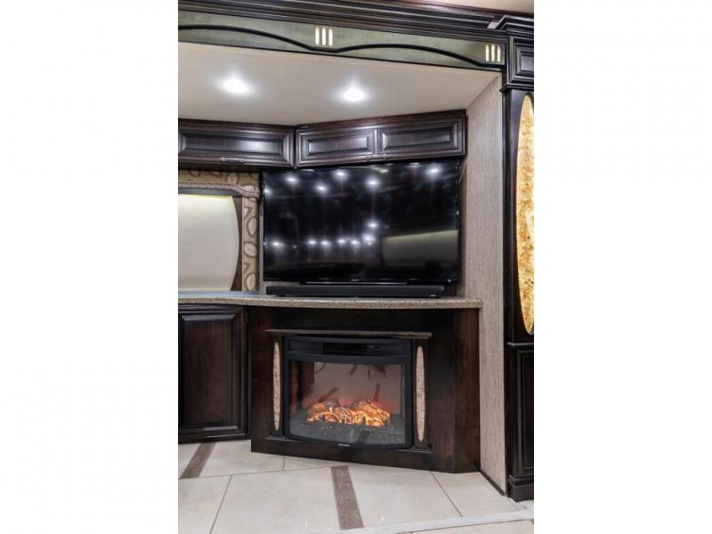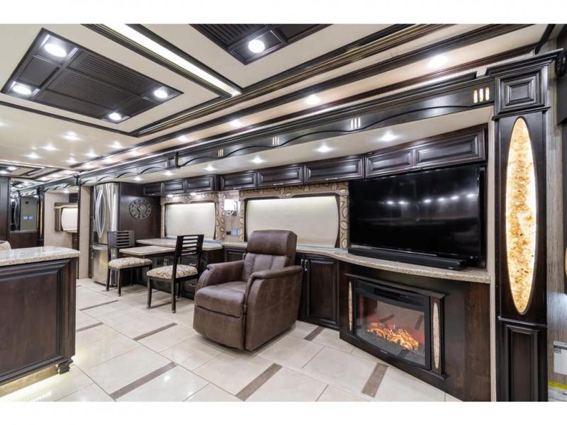 The full wall slide has an overhead TV, fireplace, recliner, buffet, hide-a-leaf dinette, refrigerator, large pantry, and in the bedroom the slide continues with a drawers and an overhead TV.
