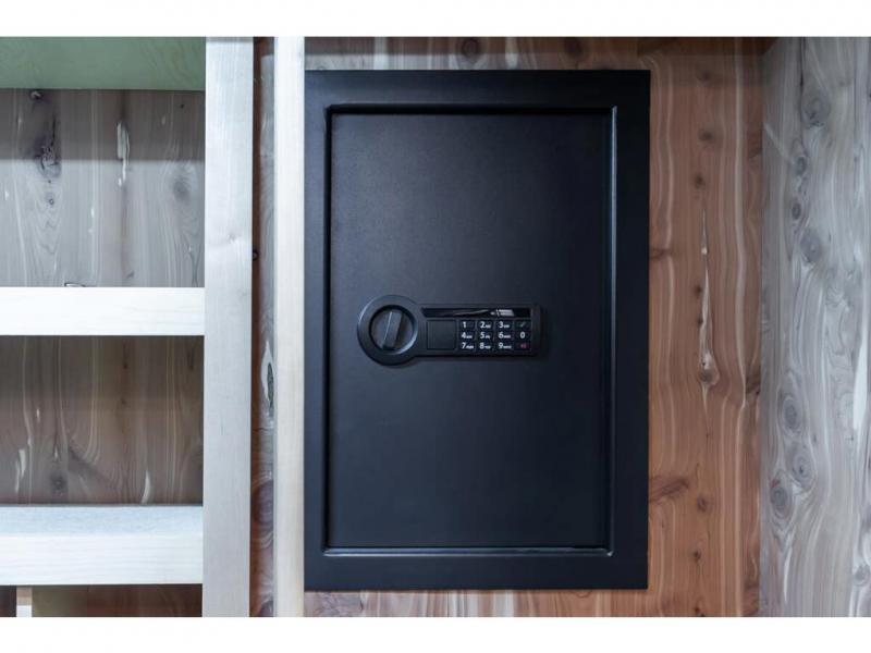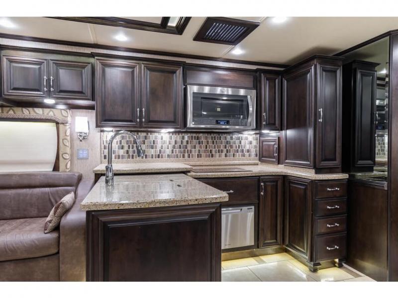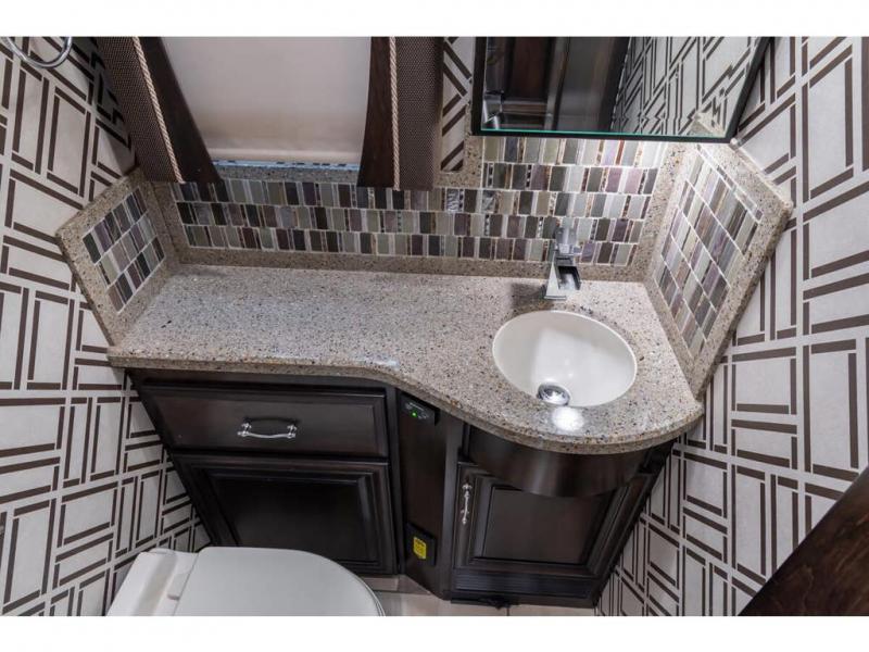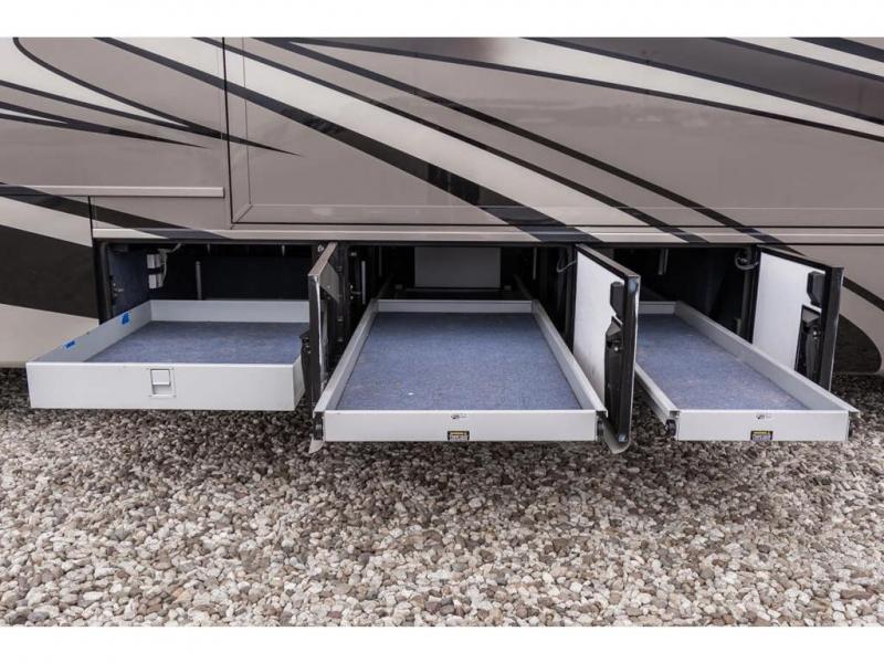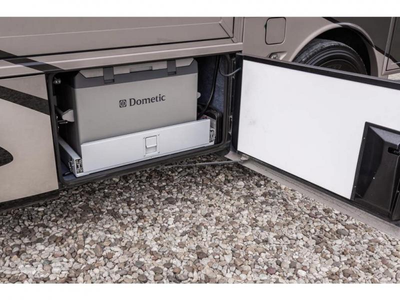 Inside this motor home find plenty of space in the main living area thanks to the full wall slide along the roadside, and the slide along the door side. The door side slide has a 84" hide-a-bed sofa, l-shaped counter with a double kitchen sink, two burner range, and next to the range you will find a pantry. There is also a large overhead cabinet above this slide for extra storage. Just past the slide you will find a half bath.