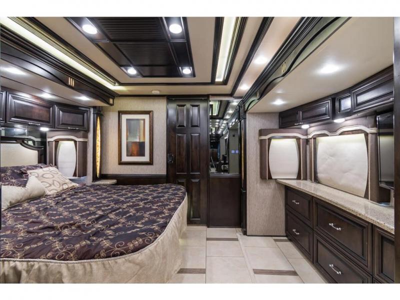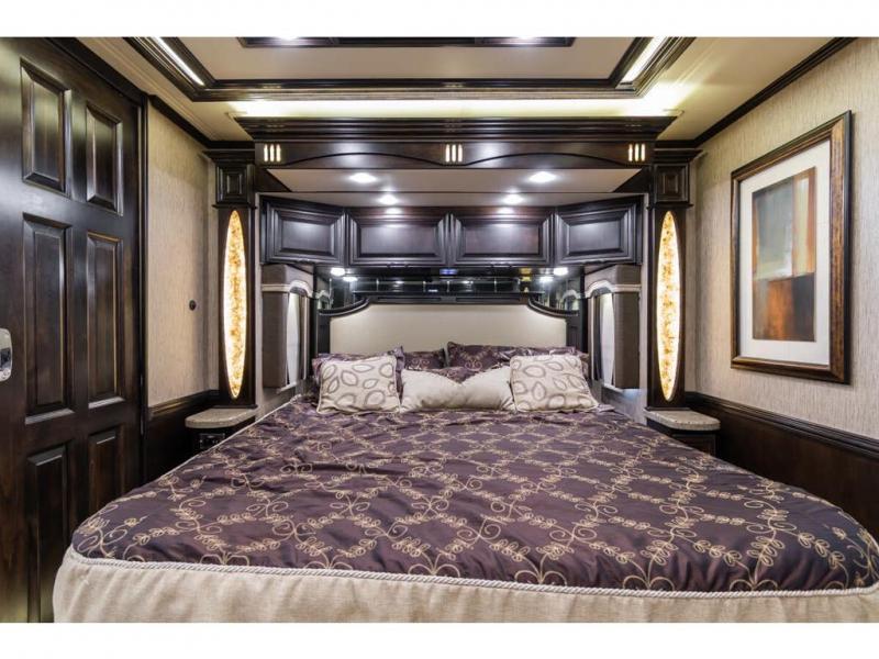 In the bedroom, across from the drawers, you will find a slide with a king bed, nightstands on either side of the bed, and an overhead cabinet above the bed.