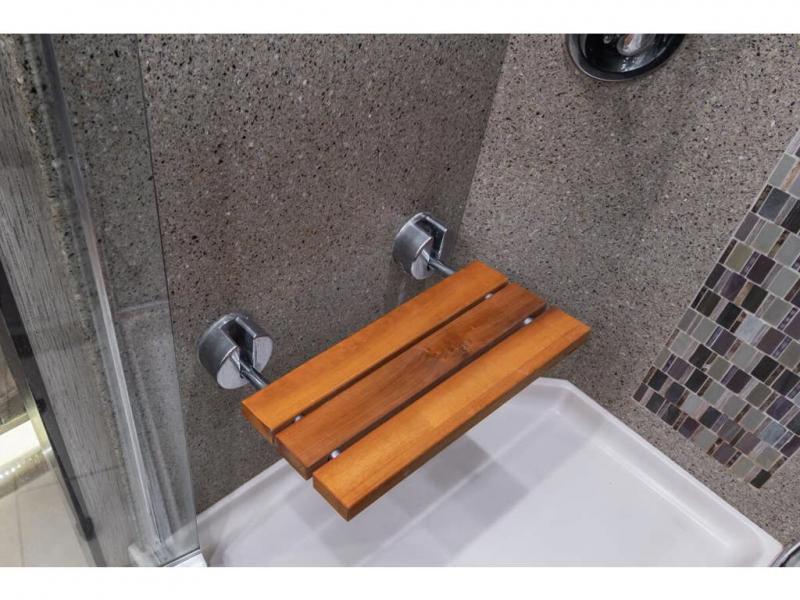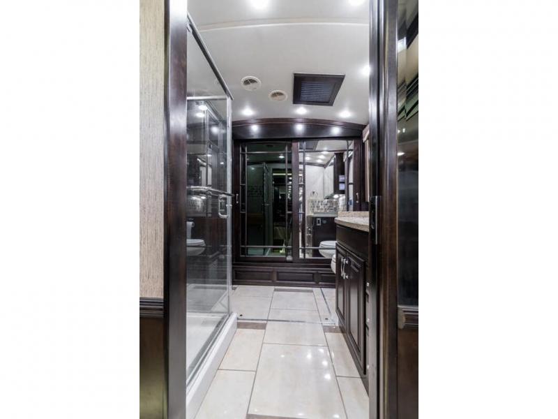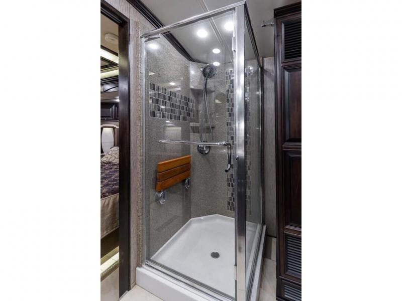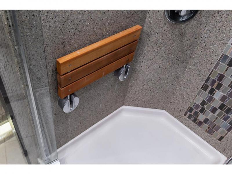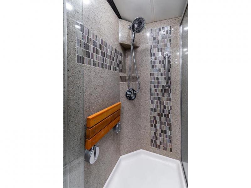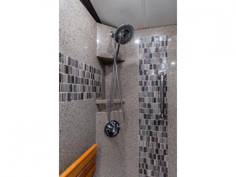 Located in the rear is a large master bathroom with a sink, toilet, wardrobe with sliding mirror doors, adjustable shelves in the wardrobe, drawers or washer/dryer, and a 50" x 34" shower, and so much more!