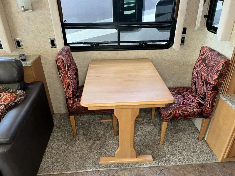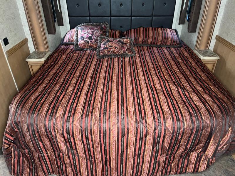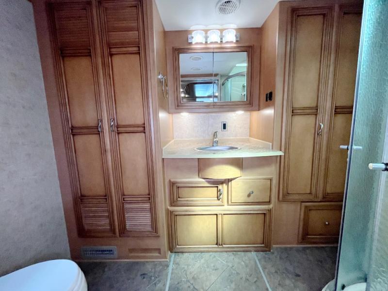 Both the driver and passenger seat swivel around to provide additional seating. Along one side of the motor home there is a slide with a 58" sofa and a booth dinette. Just around the corner from the dinette there is a half bath. On the opposite side of the motor home you will find a full wall slide with a jack-knife sofa, double kitchen sink, three burner range, refrigerator, pantry, two wardrobe, chest of drawers, and an overhead TV.