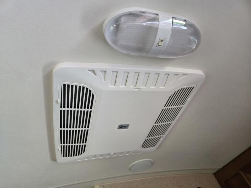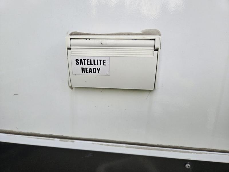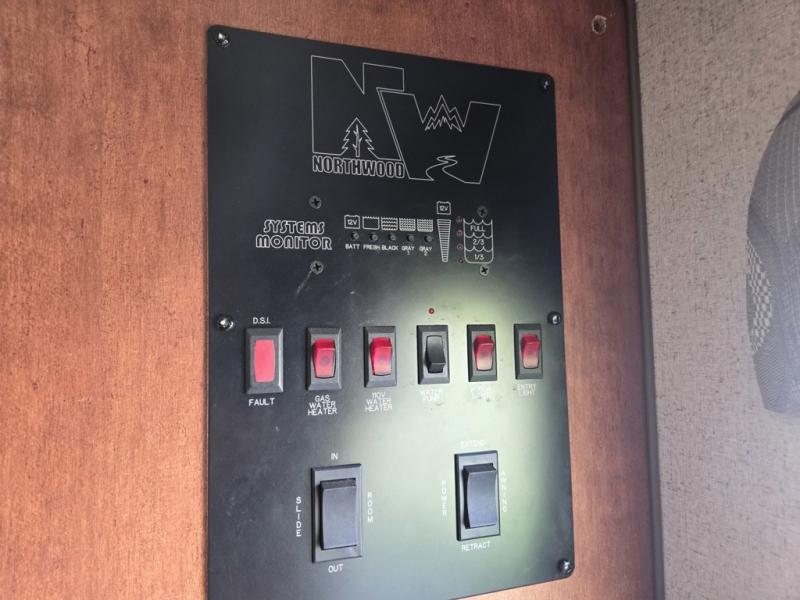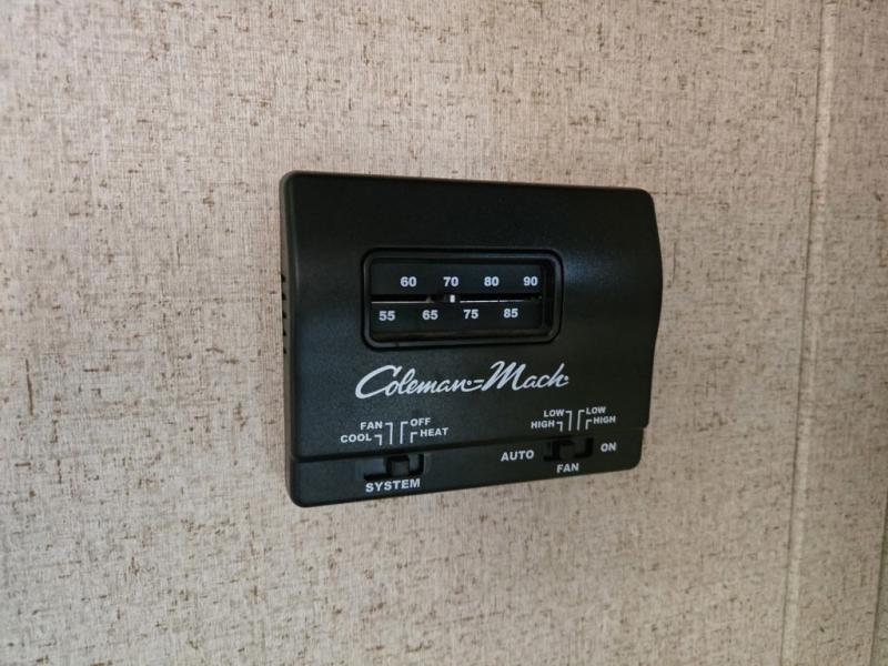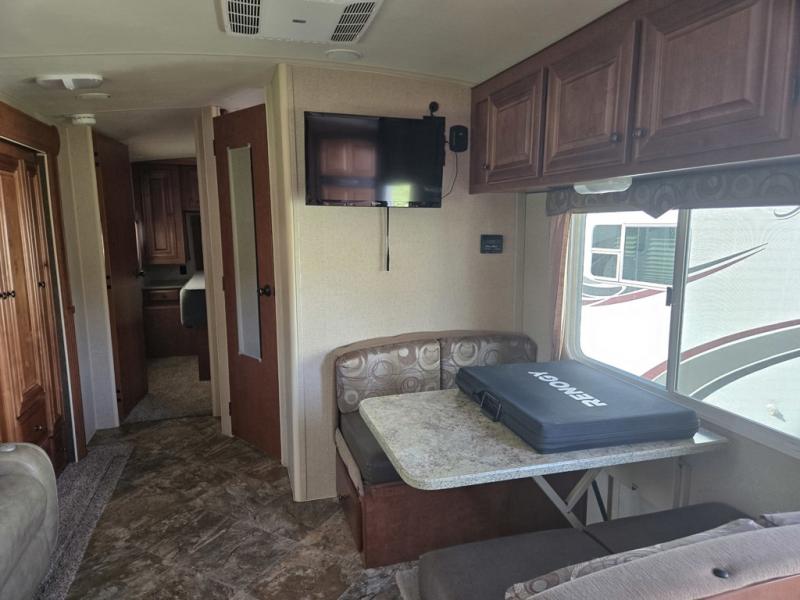 Across, a booth dinette provides room for meals. A second entry door in just beyond the booth and there is a TV mounted above the front booth seat, on the outside wall of the bathroom.