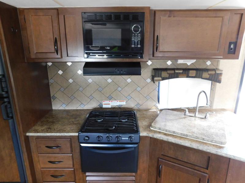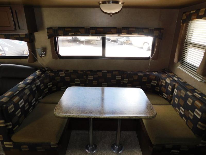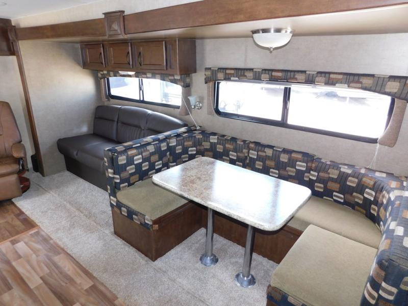 As you enter through the rear door you will find along the rear wall two lounge chairs, an end table, and a large overhead cabinet which runs the width of this trailer. Enjoy seating at the sofa and u-shaped dinette during the day, and at night both of these seating areas convert into additional sleeping space.