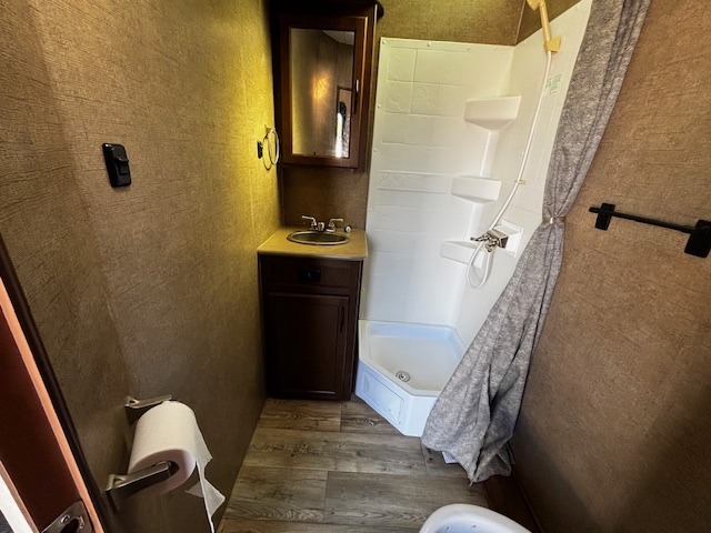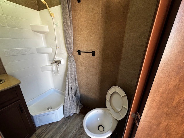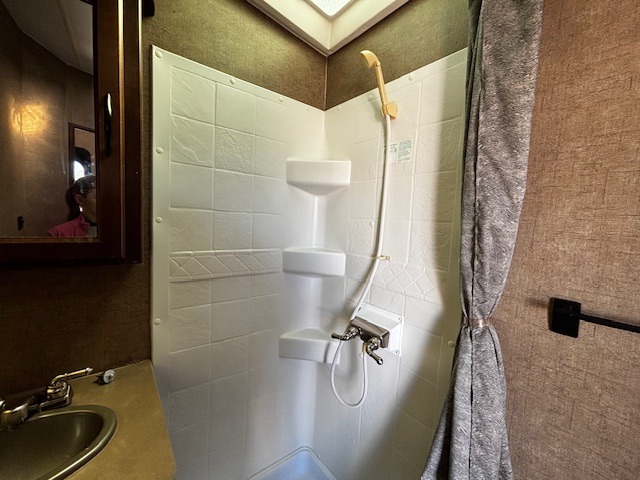 Bathroom Convenience – Angled shower, toilet, and sink located across from the main entrance for easy access.