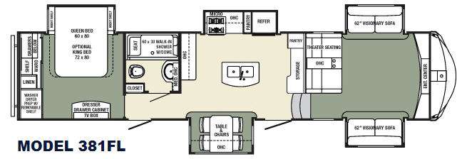 As you step inside model 381FL you will see how open it is with a dining table and two chairs just inside to the left of the forward most entry door. There is an island with a double sink in the center of the kitchen area, plus a storage area and pantry along the interior wall. A slide out three burner range, smaller pantry, refrigerator, and overhead cabinets are along the road side. Another counter area with overhead storage is along the opposite interior wall to complete the kitchen space.