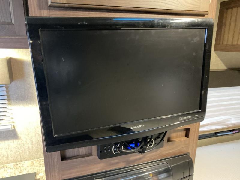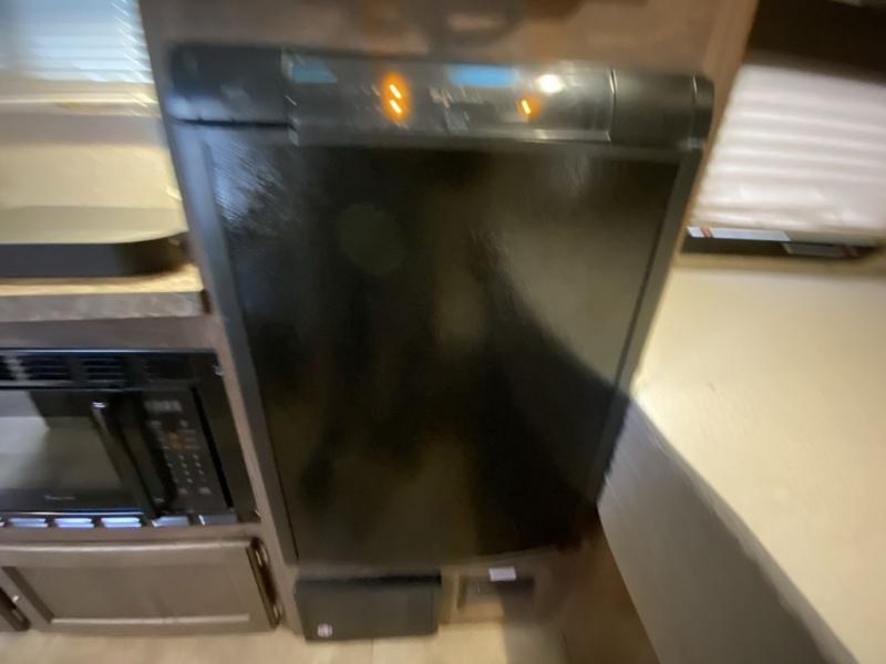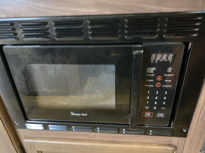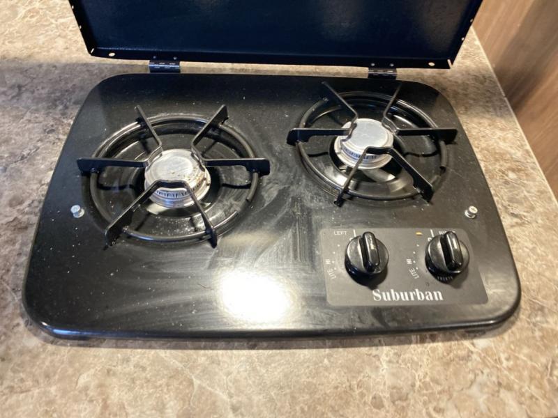 The kitchen sink is next with overhead storage, a two burner cook-top with a shelf and microwave and storage below, plus a refrigerator with storage above provides everything needed to prepare and cook food for your family.