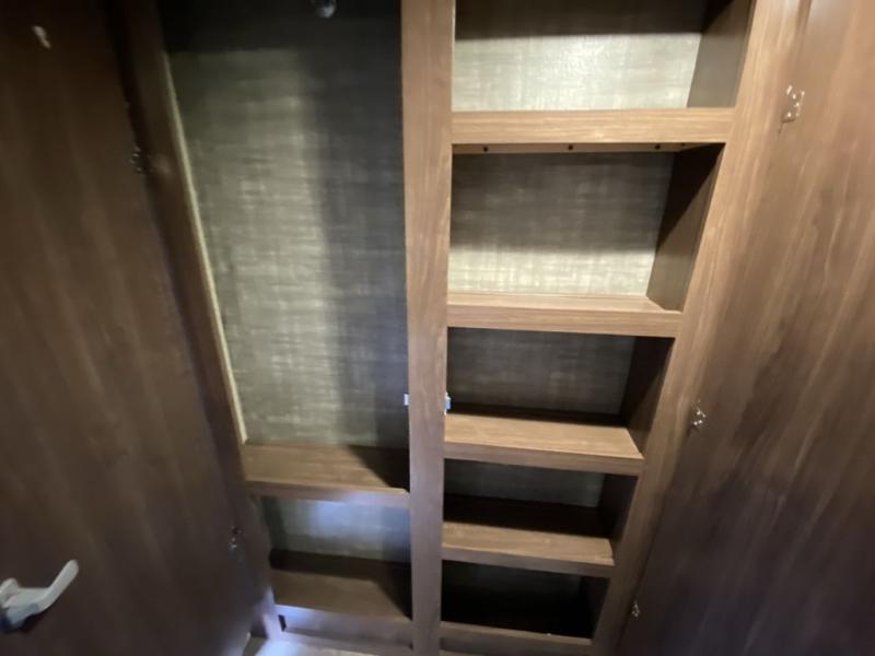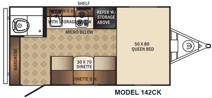 As you step inside you will see a booth dinette with overhead storage to your immediate right. There is a rear wall wardrobe on your left.