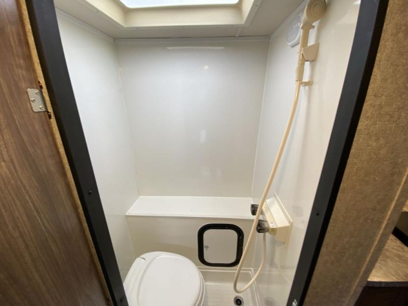 A wet bath is provided in the corner straight in from the entry door and features a toilet and shower.