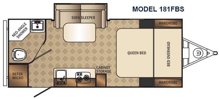 This Palomino PaloMini Lite travel trailer model 181FBS features a single slide sofa sleeper with table, rear corner bath layout, and front queen size bed.