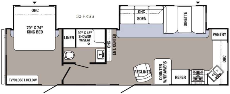 Step inside model 30-FKSS and see how convenient your next camping trip can be. There is a entertainment center straight in from the main entrance in the middle of the unit featuring overhead storage. The slide adjacent to it offers plenty of seating with a sofa and booth dinette. There is also storage above the sofa to help keep things neat and organized.