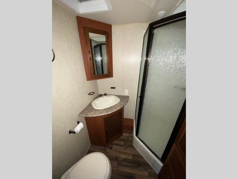 Moving toward the front, a side aisle bathroom includes linen storage, a shower with a seat, a corner vanity with sink and a toilet.