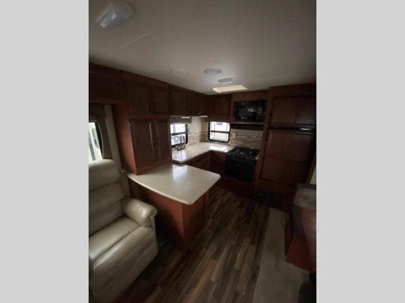 Step into the Puma 30-RKSS travel trailer by Palomino to find a large living area including a rear kitchen.
