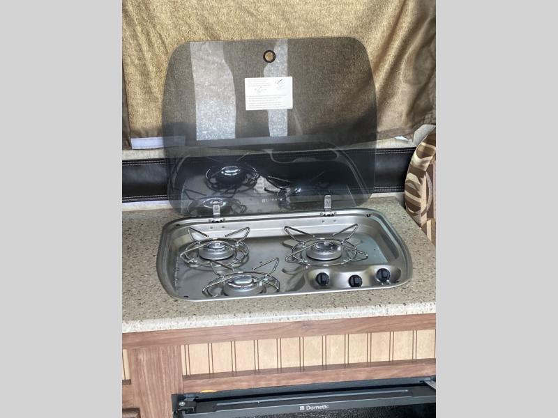 Along the road side wall you will see a two burner cook-top and single sink for making snacks or meals inside.