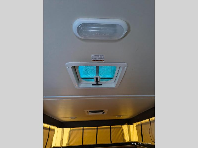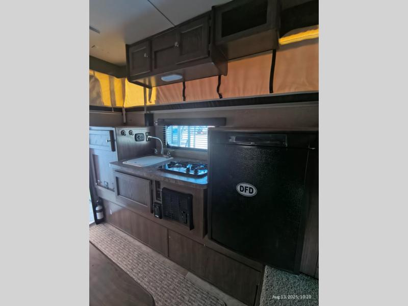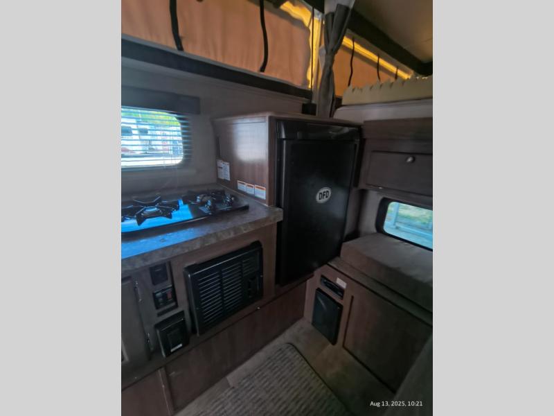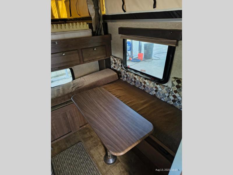This Palomino Real-Lite Soft Side truck camper 1609 features a toilet and wardrobe to the right of the entrance. Just past the private toilet area you will find a l-shaped dinette. The dinette can easily be converted to sleeping space for one individual if needed.