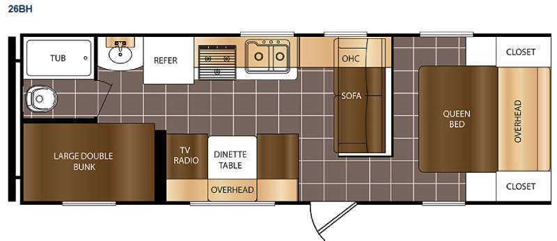 The kitchen and living area offer a sofa, double kitchen sink, three burner range, and refrigerator. The dinette is on the opposite side. You will find a spot for a TV/Radio above the dinette.