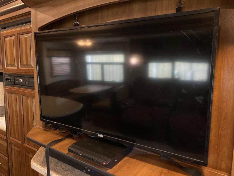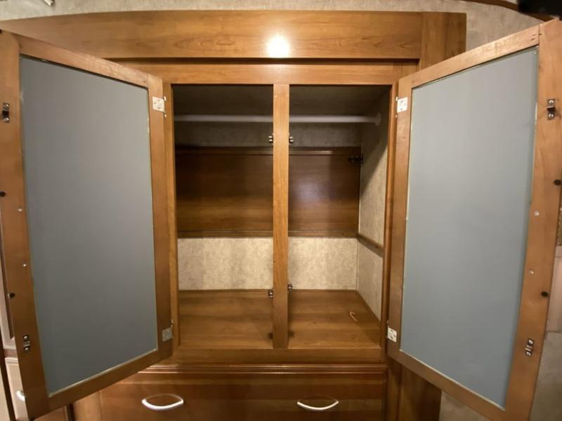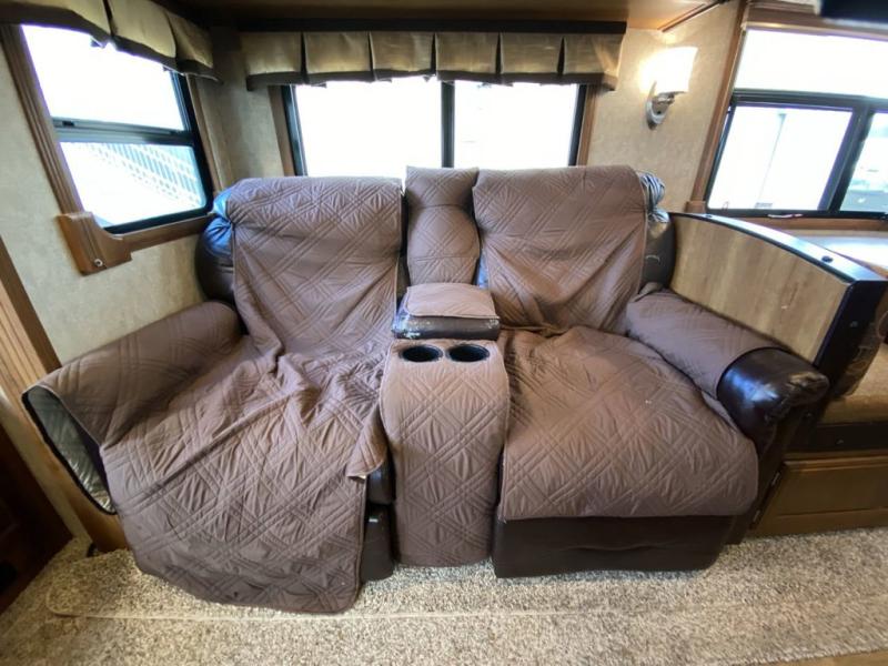 The slide that features the kitchen appliances also features a entertainment center that can easily be viewed by all of the seating in the room. Along the rear wall there is a hide-a-bed sofa with end tables and storage overhead. Opposite the entertainment center find a second slide that features theater seating and a booth dinette. There is storage above the theater seats, and the dinette can easily be turned into sleeping space at night when needed.