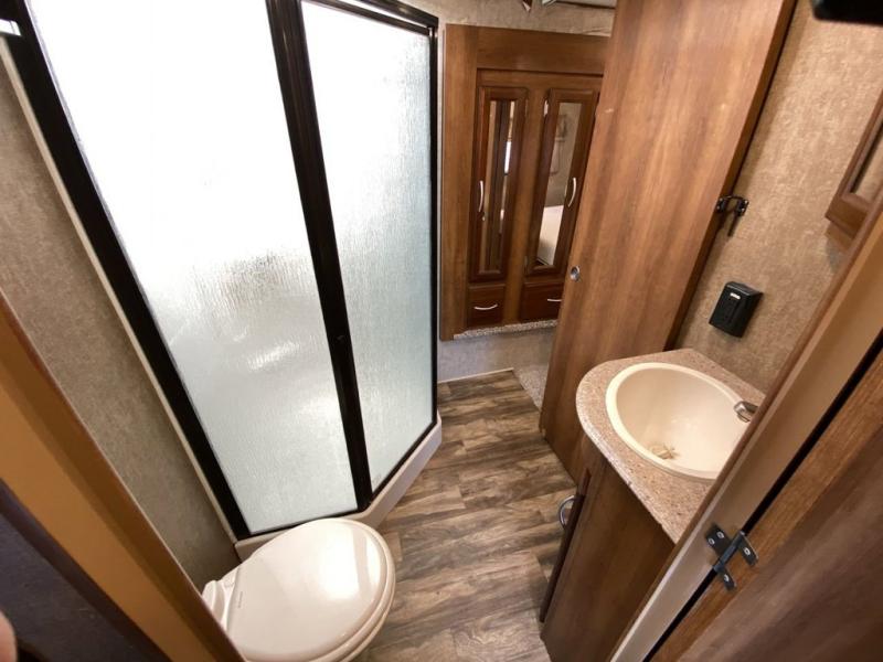 Back at the entry door head to the right up a step to the front master bedroom and complete bath. The bath is on your left at the top and offers a spacious place to freshen up. There is a corner shower, toilet, and vanity with sink. A second entry door in the bath leads into the front master where you have easy access to the linen and wardrobe storage slide out.