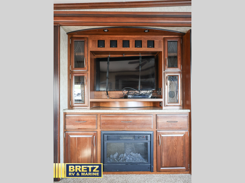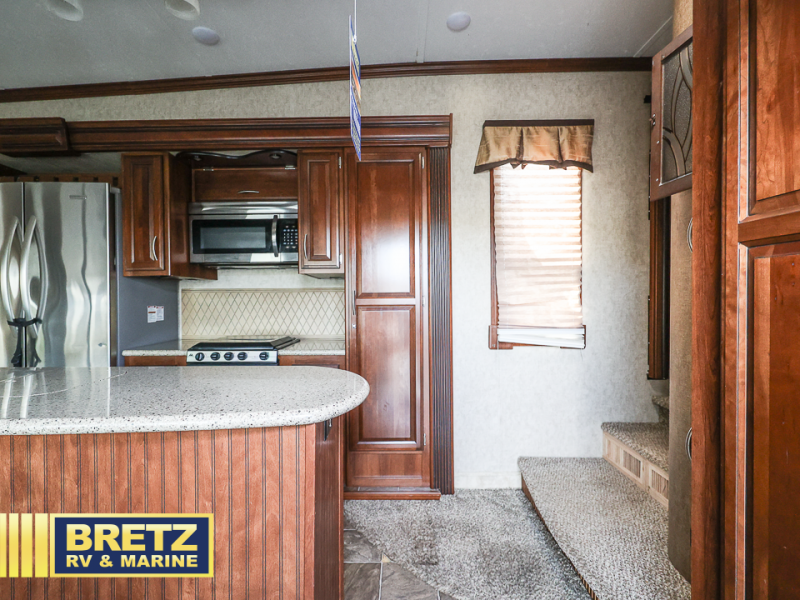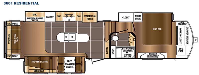 As you enter the fifth wheel, to the left is a slide with a free-standing dinette and theater seating. Along the rear wall is a hide-a-bed sofa and two end tables. There is another slide in the main living area with an entertainment center, refrigerator, three burner range, and pantry. There is also a kitchen island with a double kitchen sink.