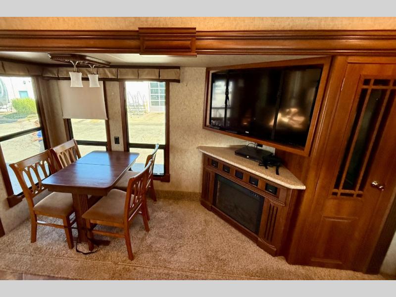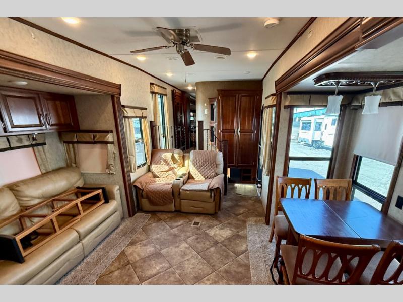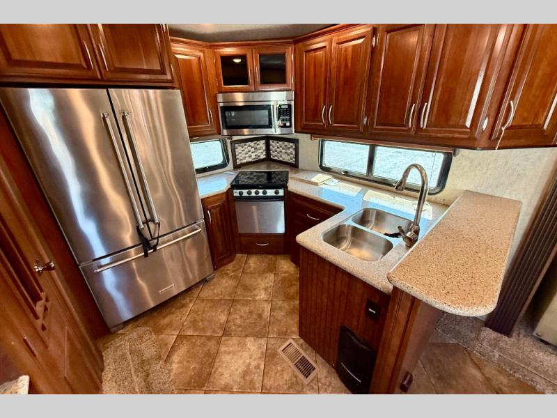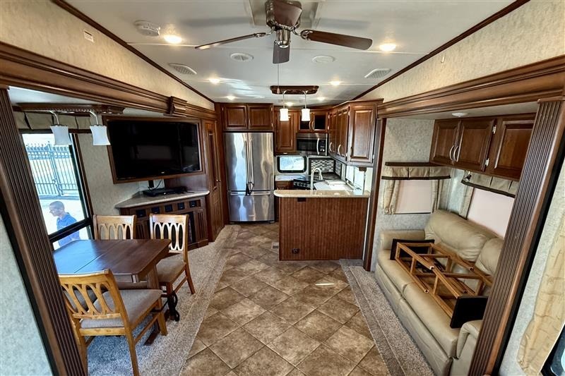 As you enter the fifth wheel along the right side there is a slide with a free-standing table and chairs, entertainment center, and pantry. The kitchen area has a large refrigerator, three burner range, l-shaped counter, double kitchen sink, and two bar stools. There is another slide in the main living area with a hide-a-bed sofa. Adjacent to the slide you will find theater seating.