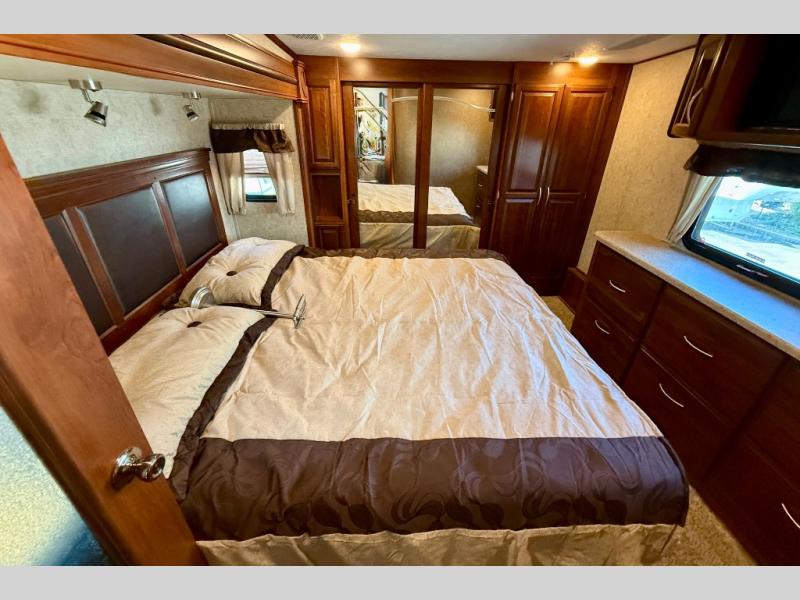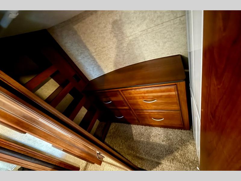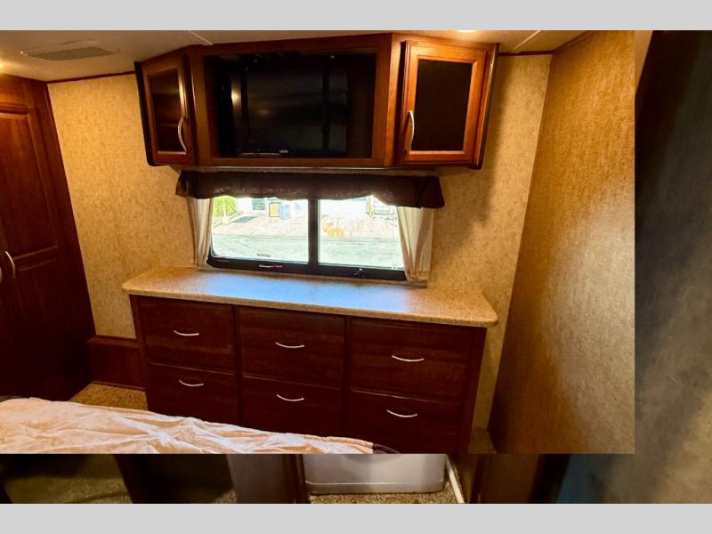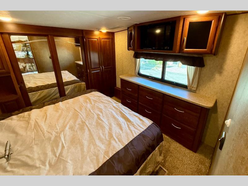 The front bedroom has a slide with a closet, nightstand, and king bed. Across from the bed there is a dresser and overhead TV. Along the front wall you will enjoy all of the space the walk-in closet offers as well as it being washer/dryer prepped, plus more!