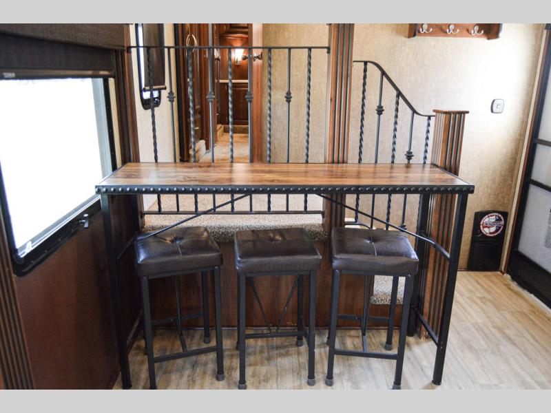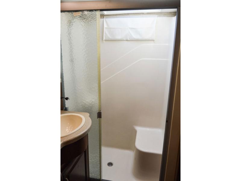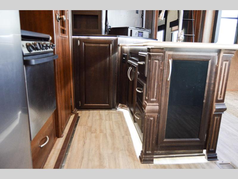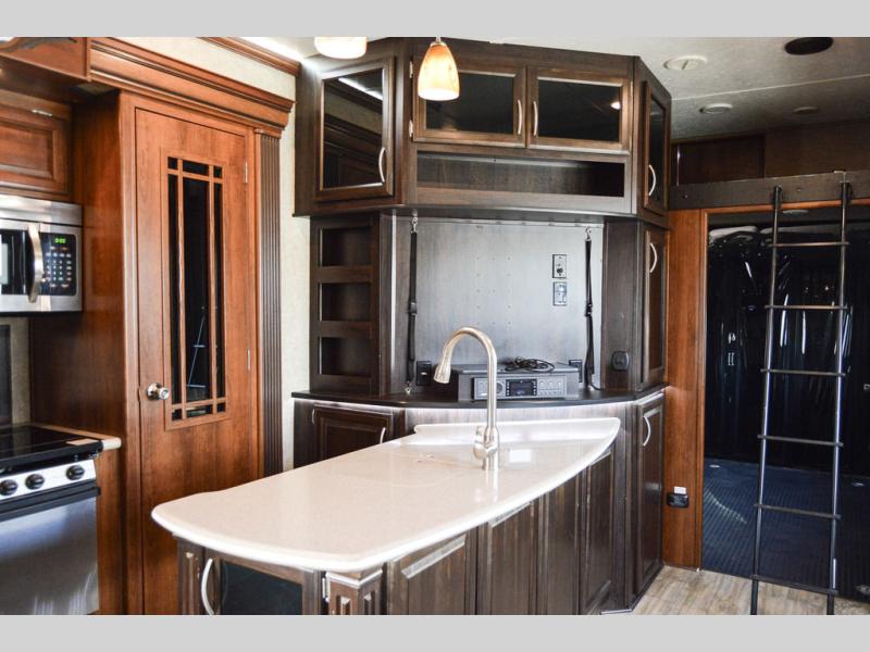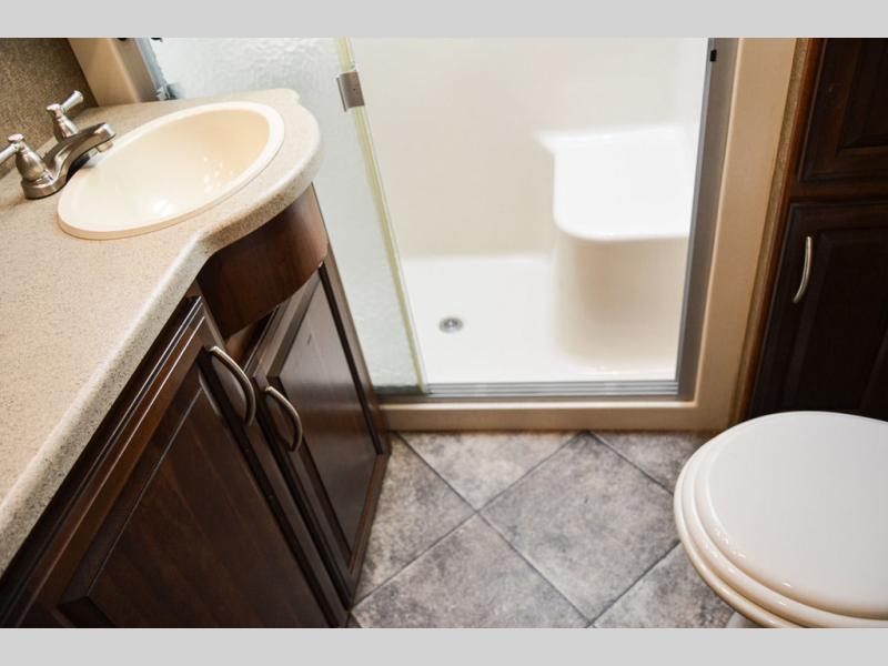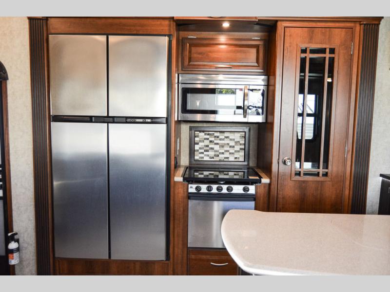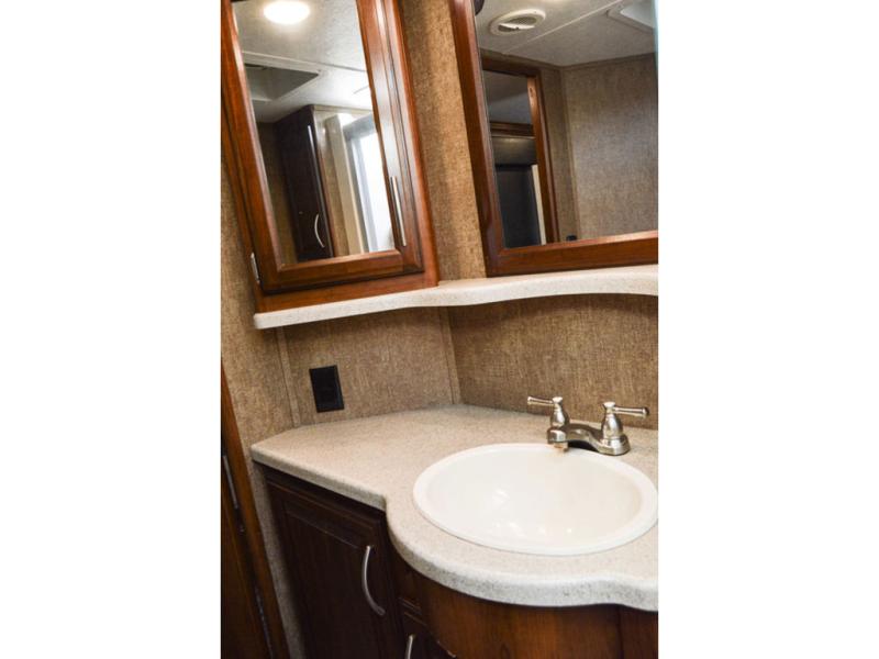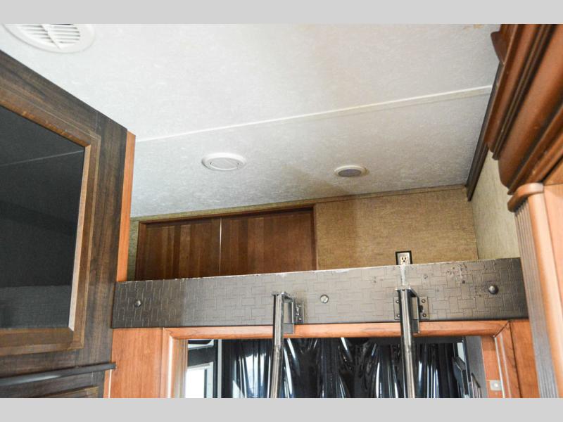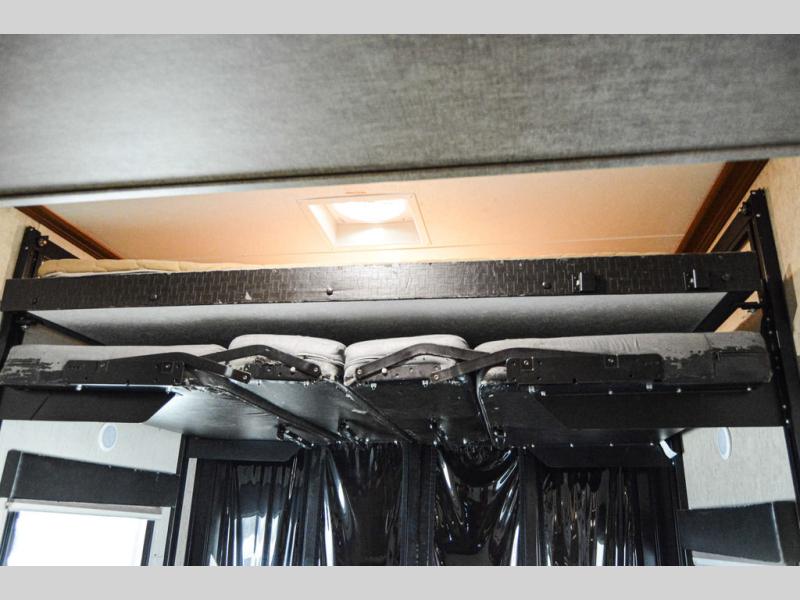 The living and kitchen area have dual opposing slides which help to open up the floor space. The first slide has an 18 cf refrigerator, three burner range, and large pantry. Adjacent to the slide there is storage and an entertainment center. You will notice that the kitchen sink is on a peninsula with extra counter space surround the sink. Across from the sink is the other slide which features a three-piece reclining sectional and stowable table. Adjacent to the reclining sectional there is additional seating with the theater seats.