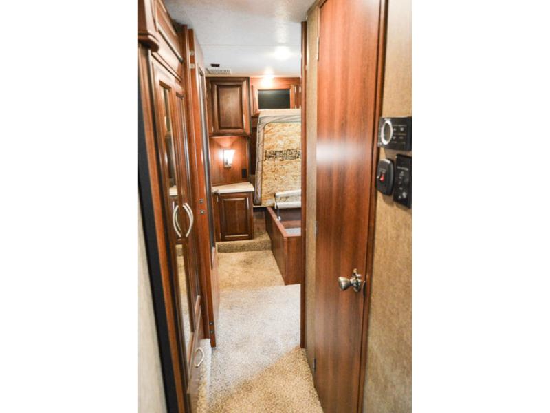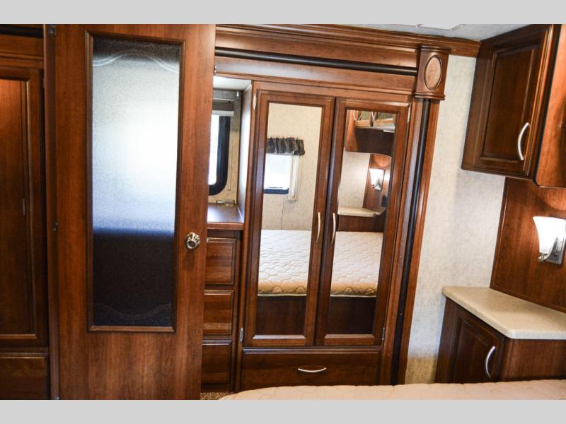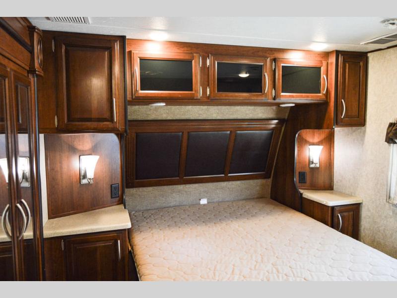 The front bedroom has a slide along one wall with two closets and a chest of drawers. There is a queen bed with overhead cabinets above the bed, and across from the bed, you will find an entertainment center.
