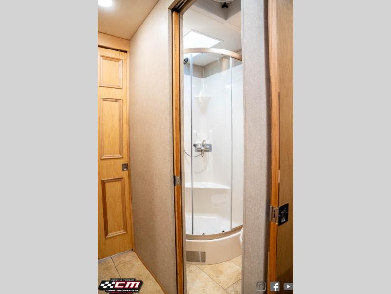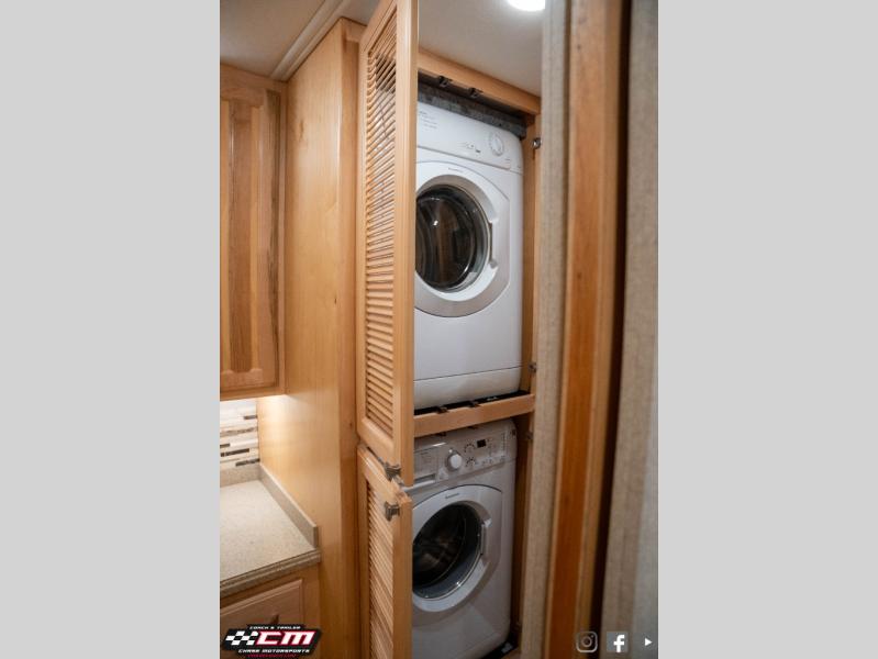 Heading toward the rear of this model, you will find that the bathroom is a walk-thru with a toilet, and a shower with skylight along the left side of the motor home, and across the hall there is the sink, medicine cabinet, and a washer/dryer.