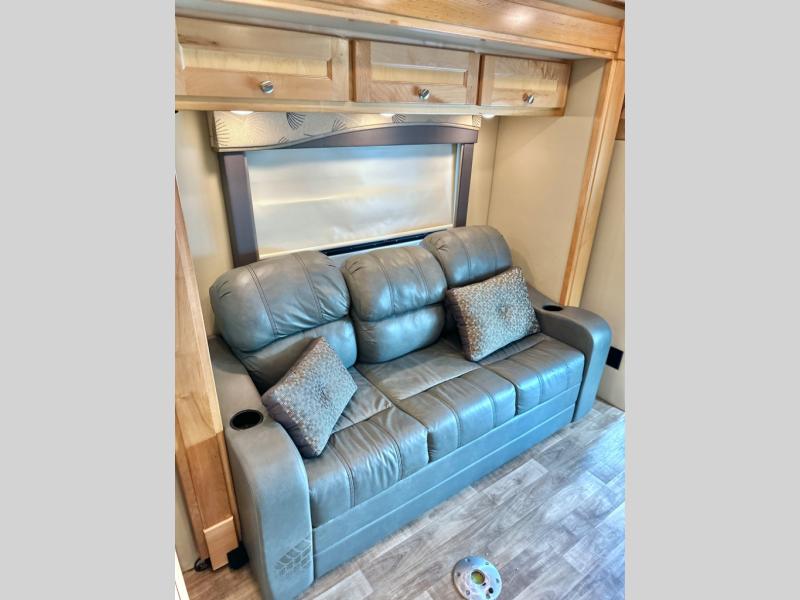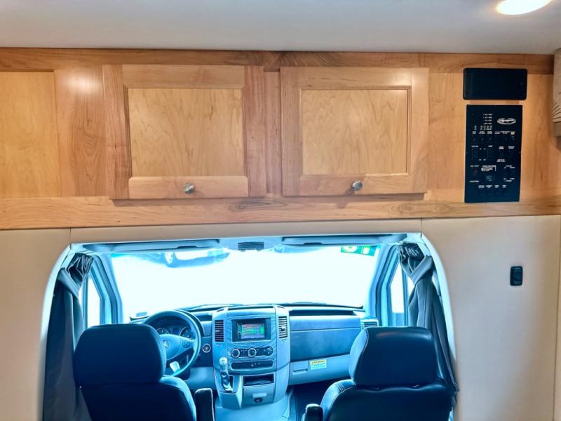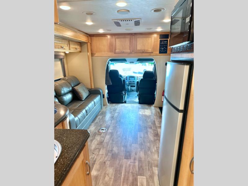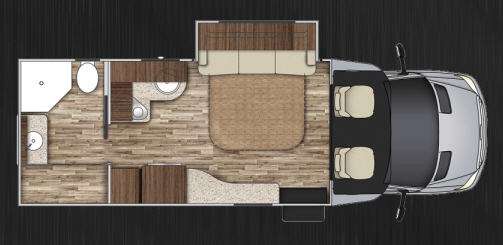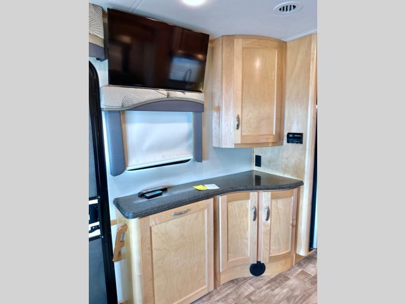 Enter just behind the front passenger seat and take a look around at how comfortable camping can be as you travel from place to place. You will enjoy plenty of space thanks to the large slide out opposite the door. This features a sofa by day, and it converts to a comfortable bed at night. Overhead cabinets make it easy to keep thing neatly tucked away.