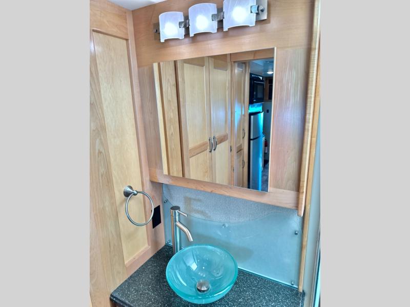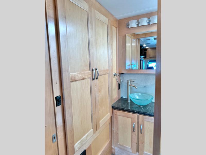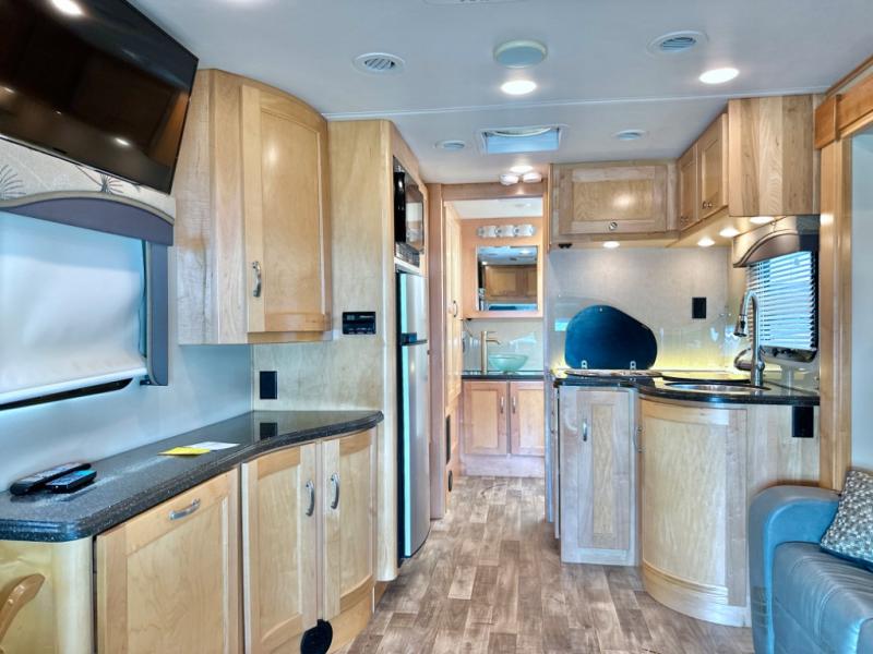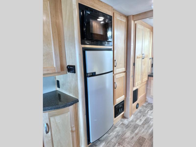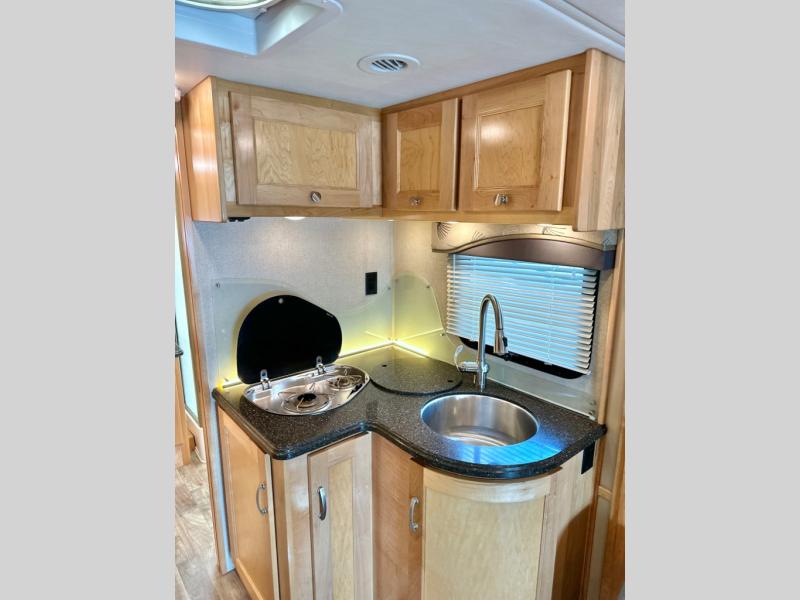 To the left of the entry door find a large counter area for food prep. At the end of the counter a refrigerator and storage. Opposite just off the sofa slide there is a kitchen area with a two burner cook-top and round kitchen sink. There are also plenty of storage cabinets as well.